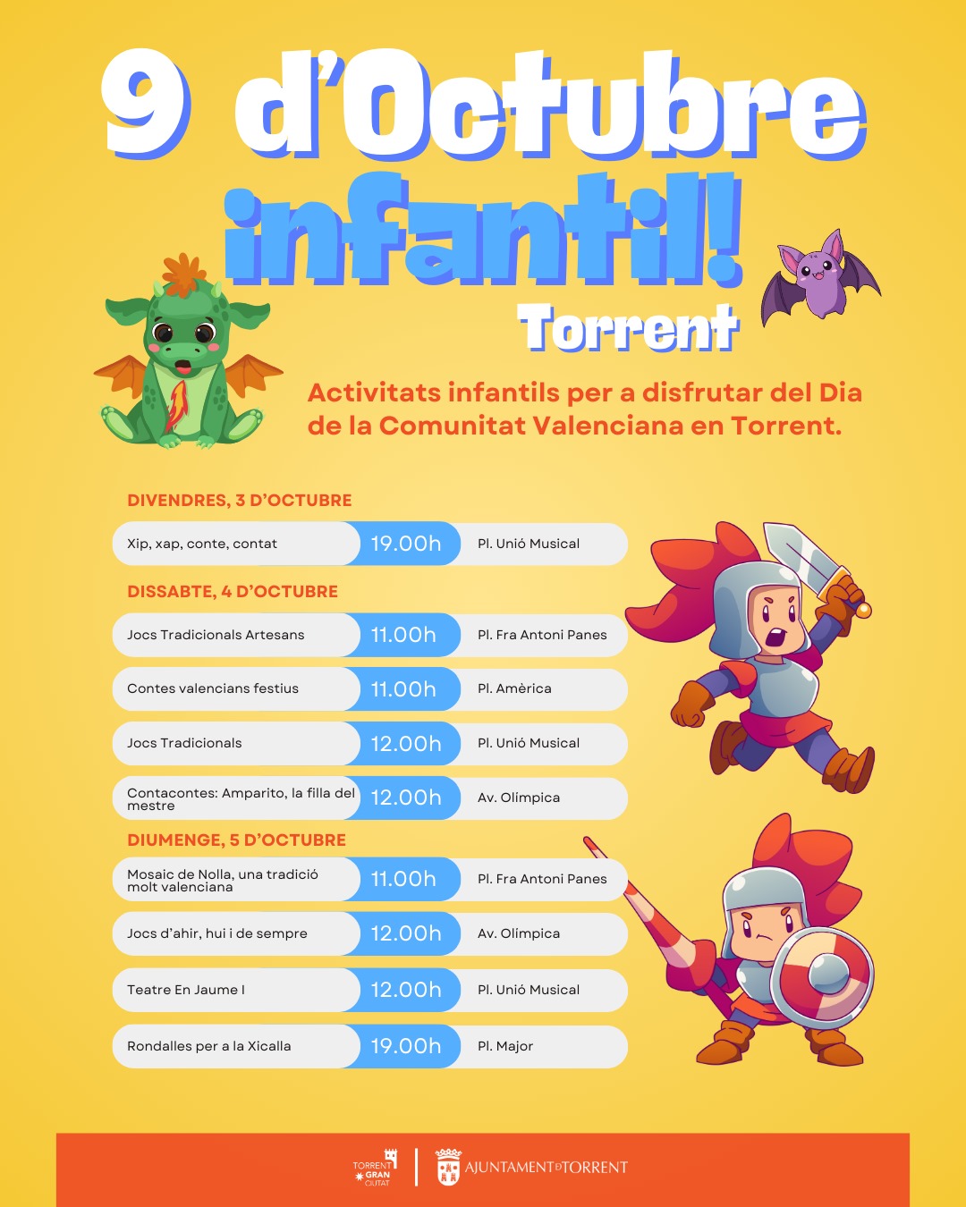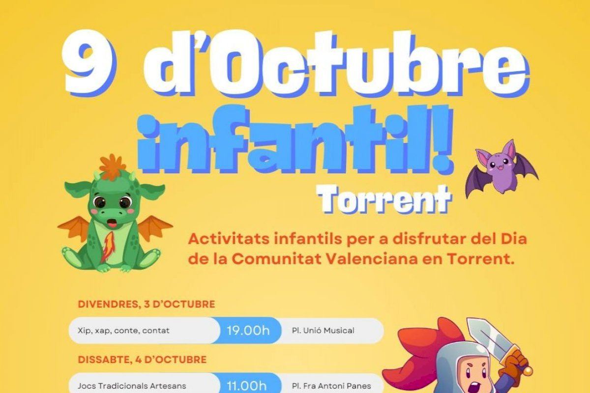 Con motivo del 9 d’Octubre, Día de la Comunitat Valenciana, el Ayuntamiento de Torrent ha organizado un completo programa de actividades infantiles bajo el título “9 d’Octubre Infantil”, con el objetivo de que los más pequeños disfruten, aprendan y se acerquen a la identidad valenciana a través del juego, el teatro y la tradición oral.