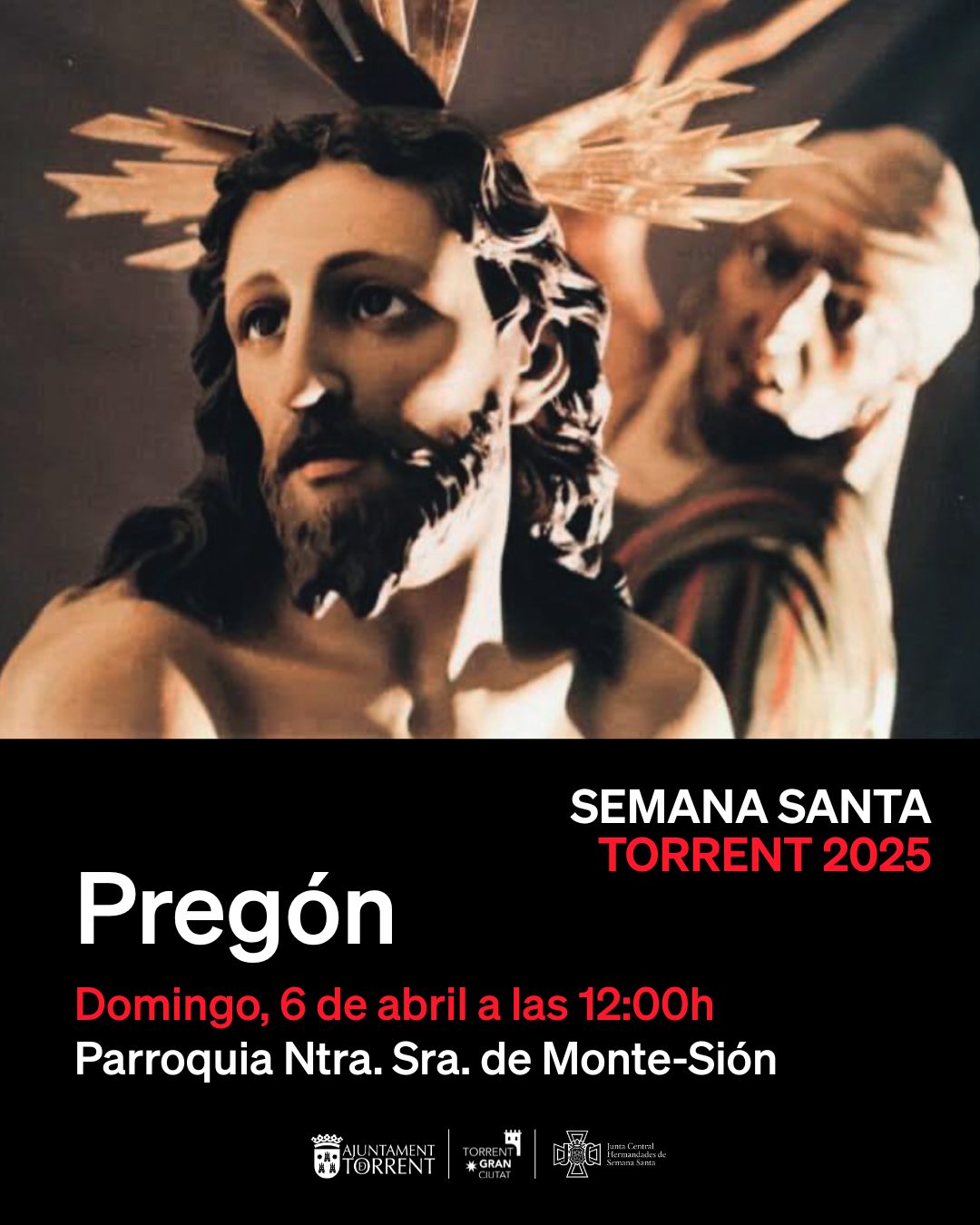 El encargado de pronunciar el pregón será el sacerdote D. Jesús Corbí Vidagañ, párroco de la Parroquia de la Asunción de Ntra. Sra. de Torrent, quien aportará su voz y reflexión para dar inicio a los actos litúrgicos y festivos que acompañarán a los torrentinos y torrentinas durante toda la Semana Santa. El acto de este domingo se desarrollará bajo un ambiente solemne, siendo un reflejo de la devoción y el fervor religioso que caracteriza a la ciudad, con la presencia de las principales autoridades y figuras de la Semana Santa torrentina.