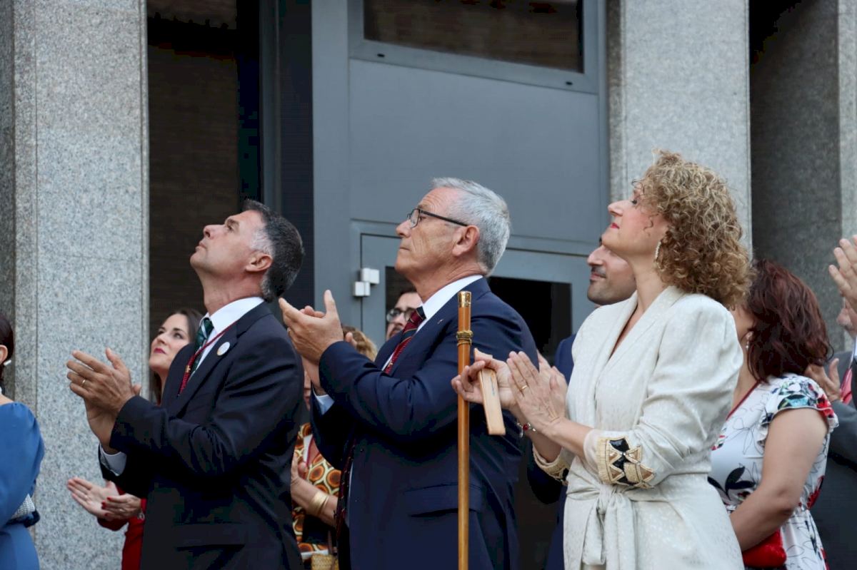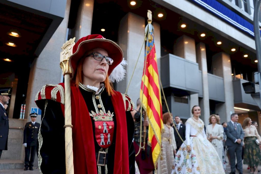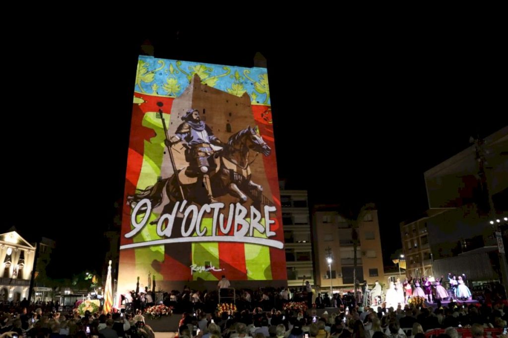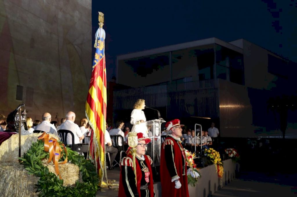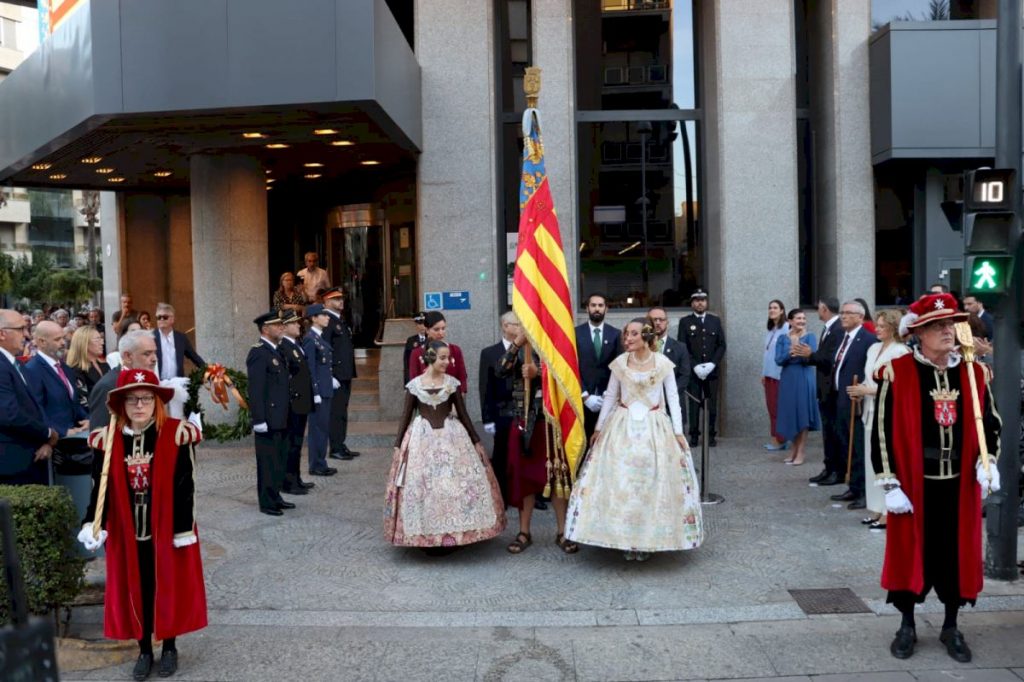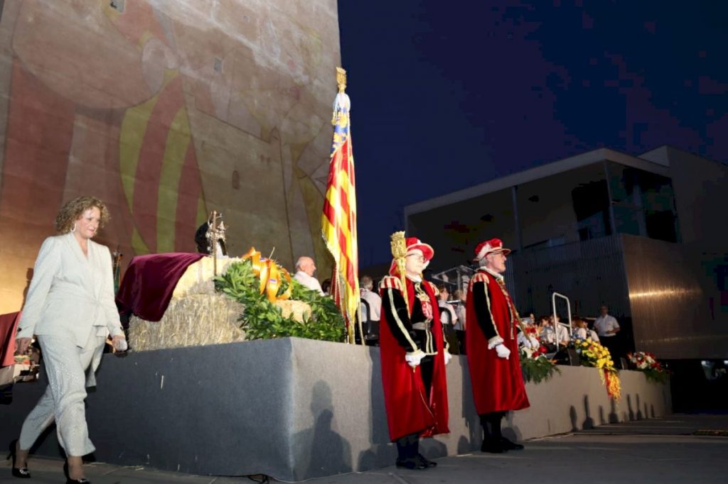 Una vez en la plaza Mayor, los representantes de las fuerzas de seguridad han presentado la bandera y el yelmo del rey Jaume a la multitud congregada a los pies de la Torre, que ha respondido con una atronadora ovación. Y, seguidamente, la Musa de la Música, María González, y el Hermano Mayor Supremo, José Vicente Viñes, han depositado la corona de laurel bajo los emblemas que representan el 9 de octubre.