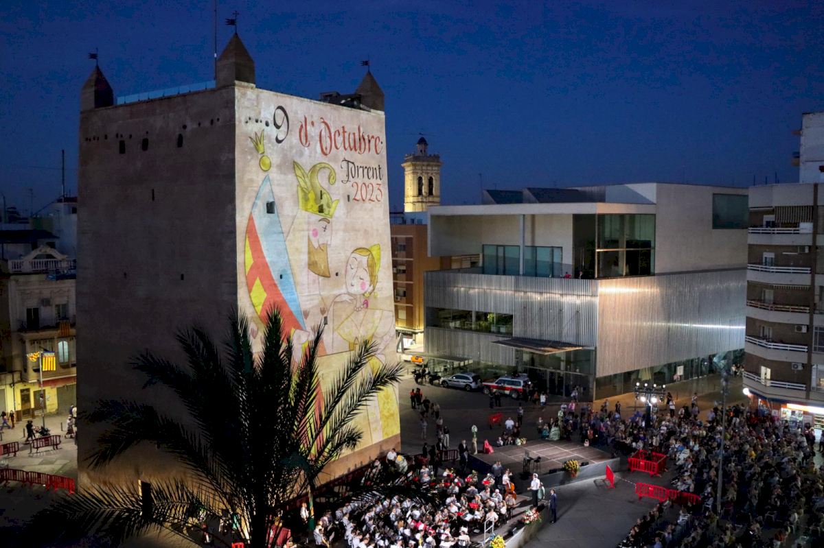 La capital de L’Horta Sud se despide de un 9 de octubre que quedará en el recuerdo de los miles de personas que han llenado sus calles en la celebración de la festa de tots els valencians. Los colores de la Senyera dibujados en el cielo de la ciudad y las voces de los torrentinos entonando a coro el himno de Torrent y de la Comunitat Valenciana han puesto el broche de oro a una velada que, como novedad, ha comenzado con el descenso de la Reial Senyera de Torrent por la fachada del ayuntamiento, dando paso, así, a la tradicional procesión cívica en honor a la entrada de Jaume I en Valencia allá por el año 1238. Otro de los cambios de esta edición es que el recorrido ha discurrido por la Avenida al Vedat, haciendo más visual y disfrutable su paso para todos los vecinos.
