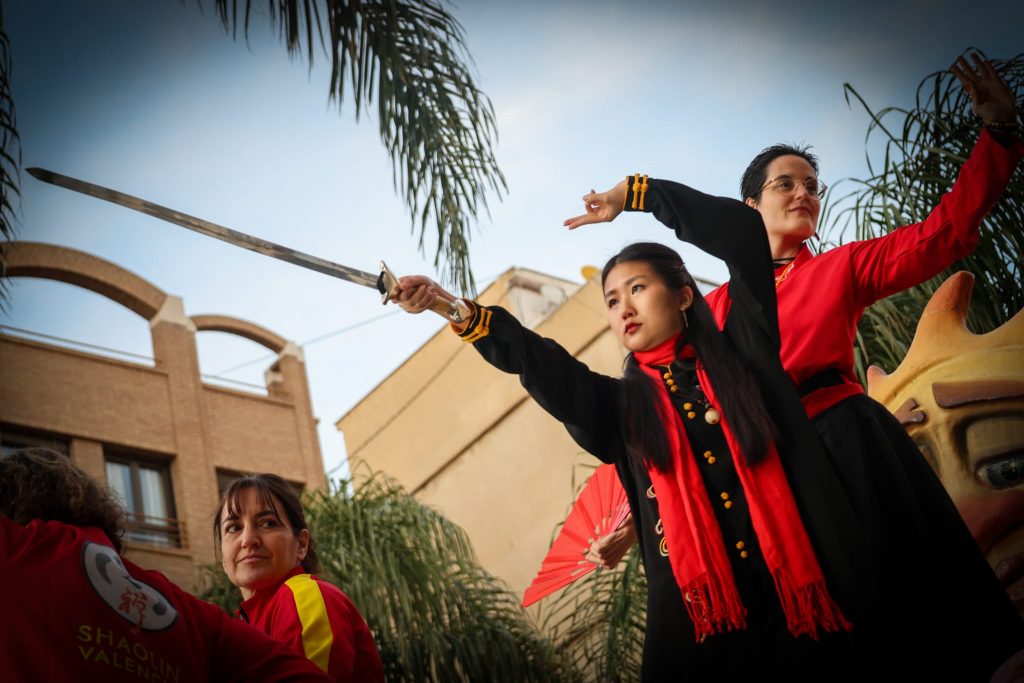 Tras la representación institucional, el desfile dio paso a una explosión de tradición y simbolismo. Mujeres ataviadas con trajes tradicionales chinos desfilaron junto a dos grandes leones de vivos colores y un imponente dragón que interactuó constantemente con el público, especialmente con los más pequeños. El Centro Cultural Shaolin Valencia ofreció exhibiciones de artes marciales que despertaron la admiración de los asistentes.