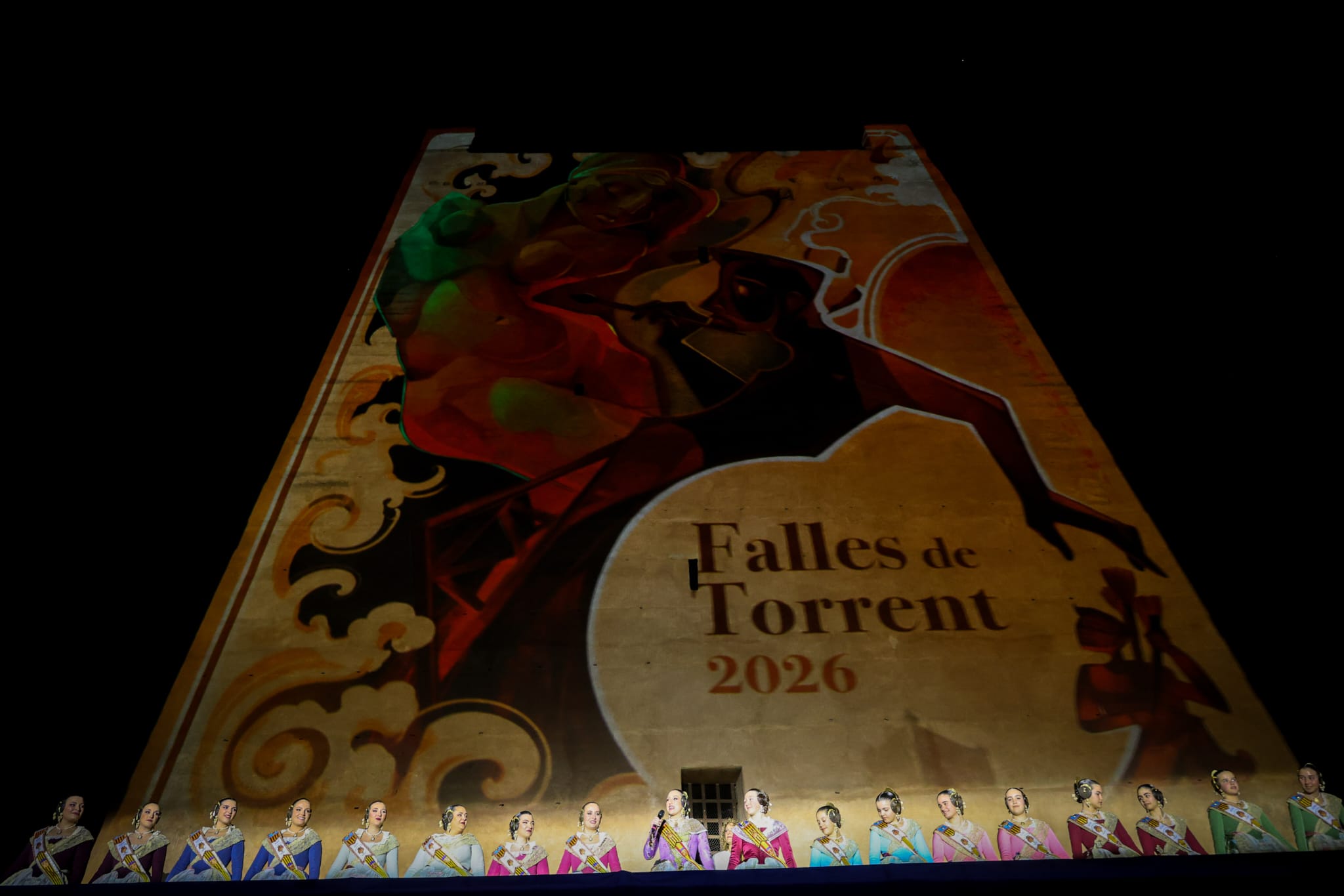 A las 20:00 horas comenzaba el acto oficial con un gran videomapping conmemorativo, proyectado sobre la Torre, que recorrió la historia de las 50 Crides celebradas en Torrent (1976–2026). La proyección incluyó un repaso visual a todas las Falleras Mayores que han representado a la ciudad, la aparición de los escudos de las 28 comisiones y la imagen oficial de las Fallas 2026, en un ejercicio de memoria colectiva que emocionó al público asistente.