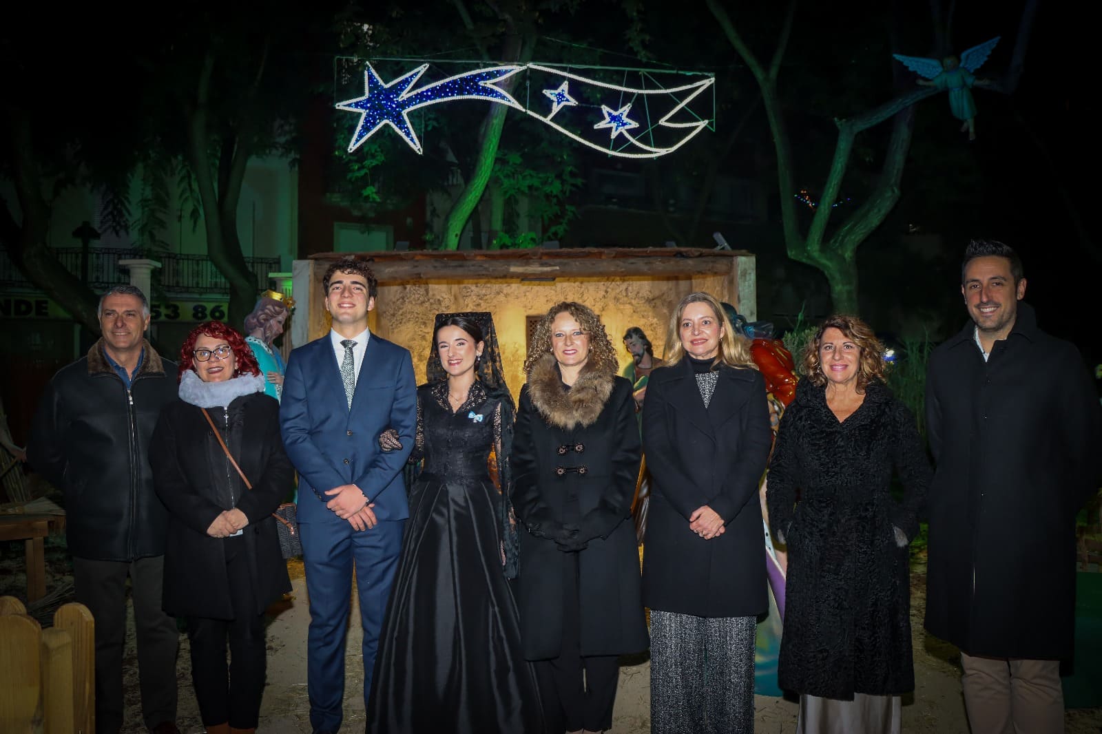 Acto seguido, la alcaldesa y la clavariesa mayor pulsaron conjuntamente el botón que encendió las luces del Belén, iluminando su portal, el nacimiento y la estrella que preside toda la escenografía. En ese momento, nuevos fuegos artificiales estallaron tras la plaza, arrancando los aplausos del público.
