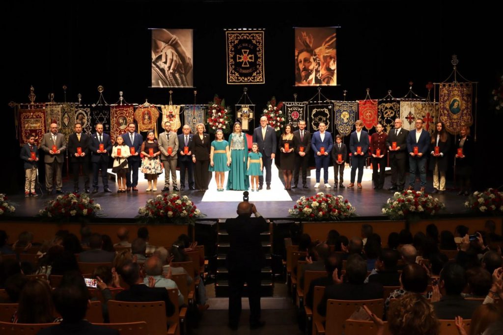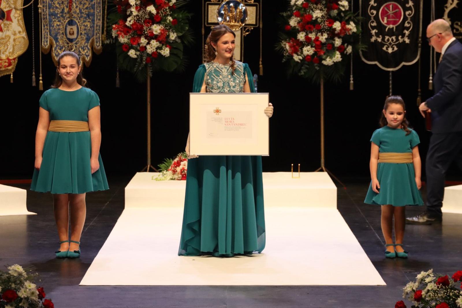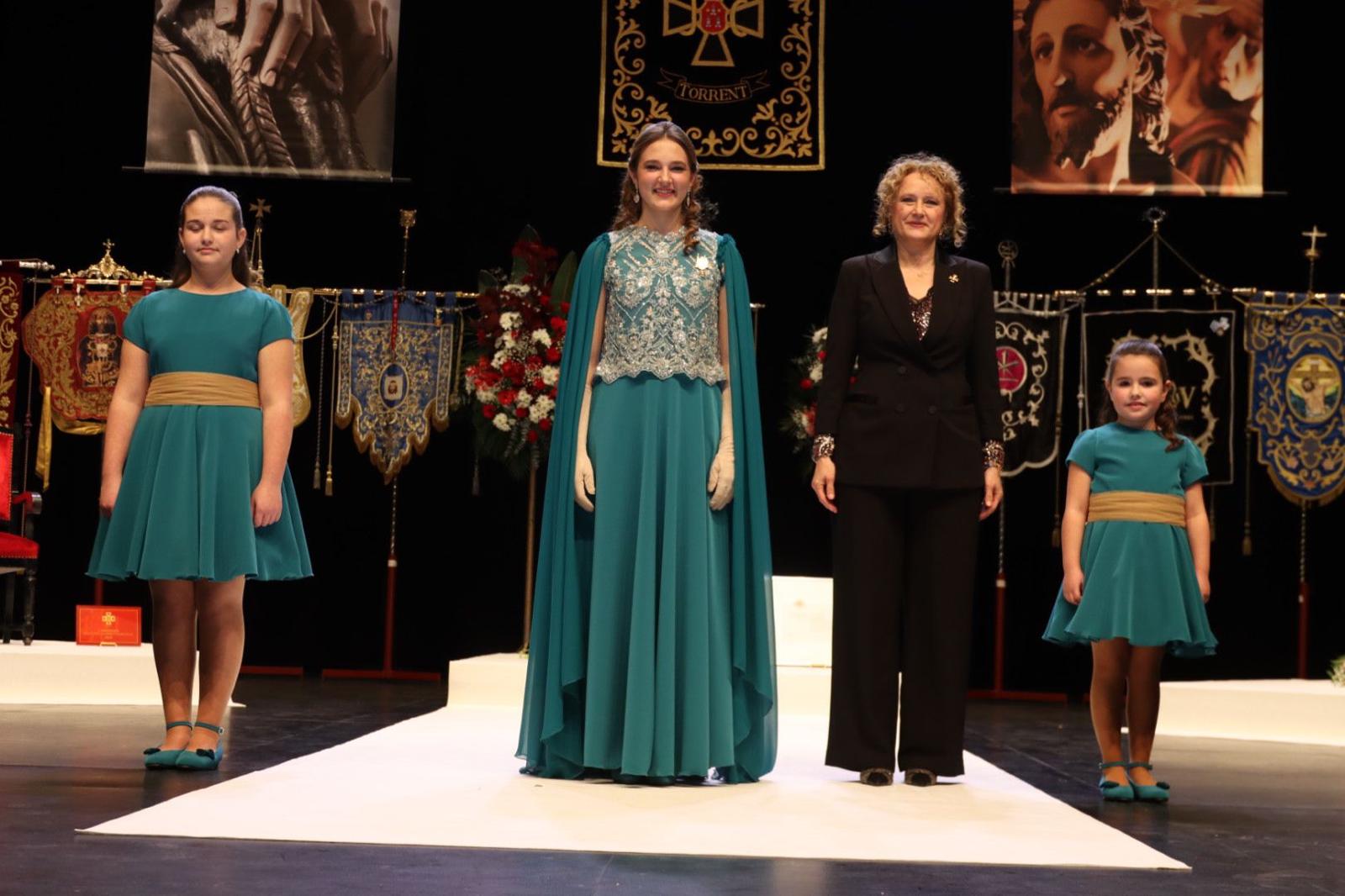 La alcaldesa de Torrent, Amparo Folgado, fue la encargada de imponer el broche de Reina del Encuentro a Lucía Mora, quien también recibió el cuadro que la acredita en su nuevo cargo de manos de José Vicente Yago, presidente de la Junta Central de Hermandades de Semana Santa.