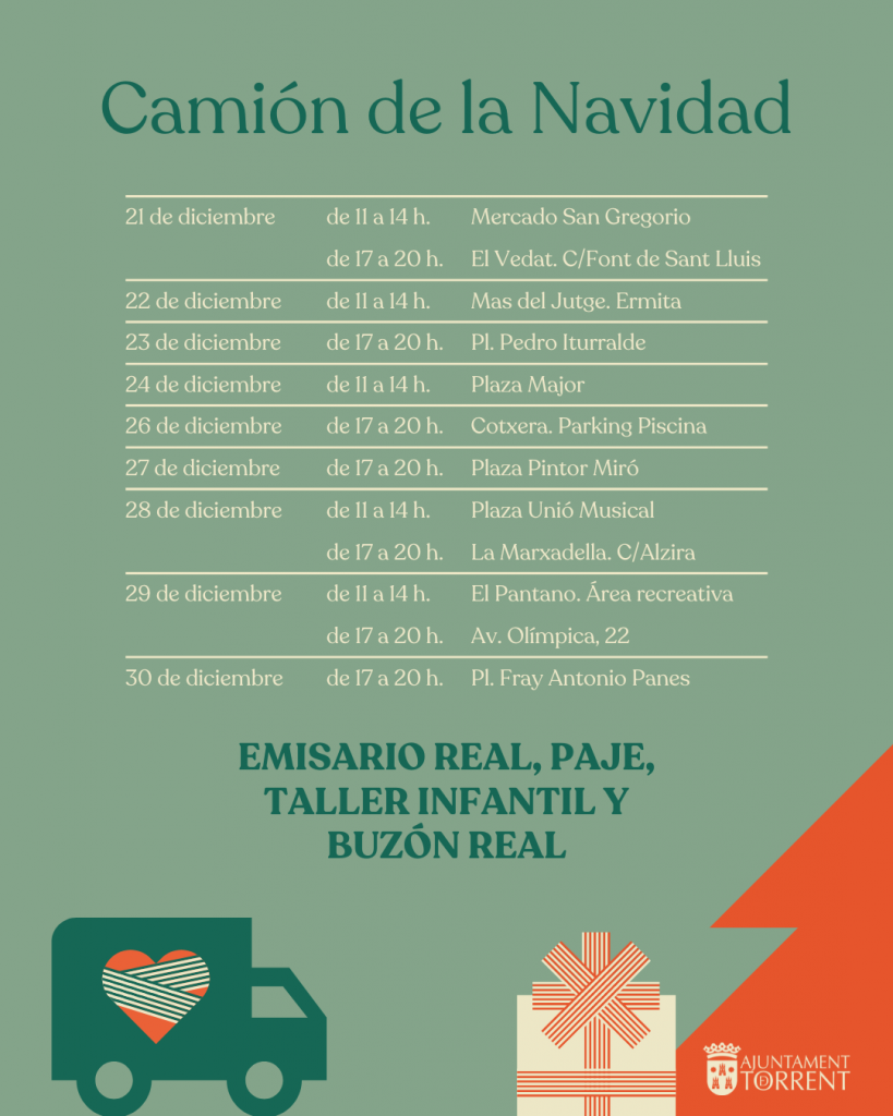 Por la tarde, de 17:00 a 20:00h, el Camión de la Navidad se trasladará a La Marxadella, concretamente en la calle Alzira, continuando con su recorrido festivo por Torrent y acercando la magia de los Reyes Magos a todos los barrios.