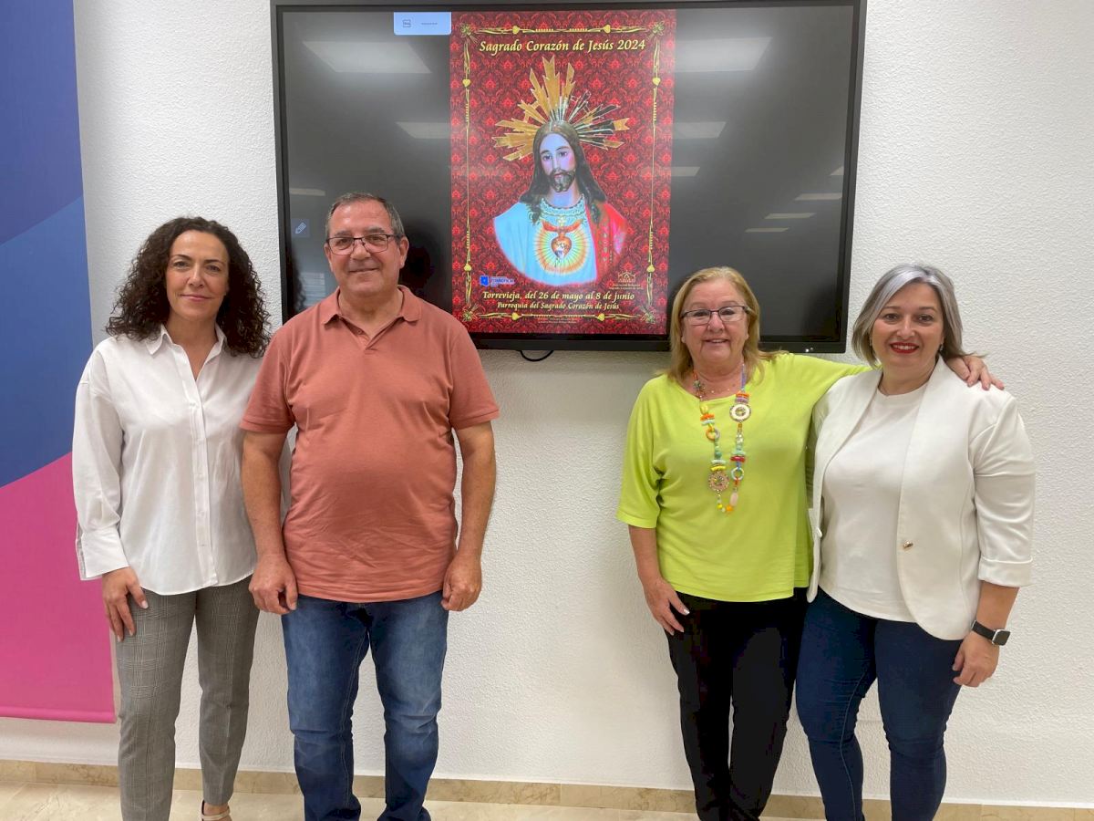 La concejal de Fiestas del Ayuntamiento de Torrevieja, Rosario Martínez Chazarra, el presidente de la Asociación del Sagrado Corazón de Jesús, Gregorio Navarro, y la miembro de la Junta Directiva, Heidi Aznar, han presentado en la mañana de hoy las Fiestas del Sagrado Corazón, que se celebrarán del domingo, 26 de mayo, al sábado, 8 de junio.