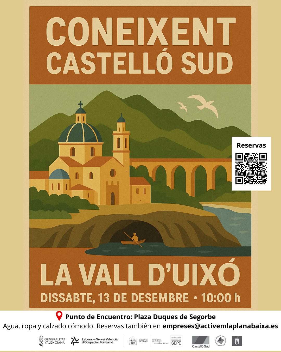 El ciclo Coneixent Castelló Sud cierra su programa 2025 con una visita muy especial en la Vall d’Uixó. El próximo sábado 13 de diciembre, la salida será a las 10:00 h desde la Plaza Duques de Segorbe para iniciar el recorrido del Camino del Agua, una ruta que recorre el casco urbano siguiendo la antigua acequia que nace en la salida de las Coves de Sant Josep y que permite descubrir los principales hitos patrimoniales de la ciudad.