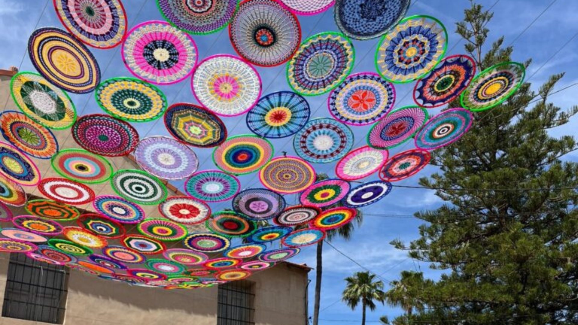 La Concejalía de Mujer e Igualdad del Ayuntamiento de Benejúzar, que dirige Paula García, ha presentado hoy el colorido toldo de ganchillo elaborado de forma artesanal y en tiempo récord por mujeres de Benejúzar. Una iniciativa municipal desarrollada desde la Asociación de Mujeres ‘La Oropéndola’ para vestir y engalanar las calles del municipio durante la celebración de sus fiestas patronales que, “con menos de un mes de trabajo, han conseguido realizar las 84 piezas elaboradas a mano que componen este tapiz, y que lucirá en esta zona de la Plaza de España los días grandes del municipio”, ha señalado García.