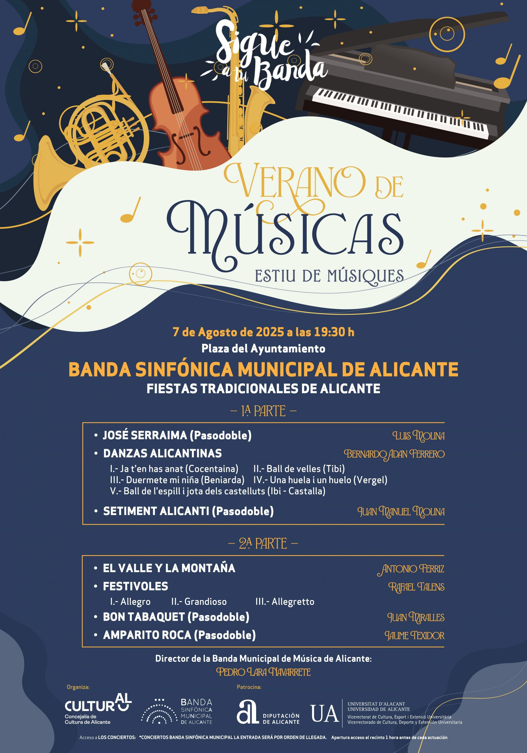 Un concierto de música tradicional prologa este jueves, a las 19.30 horas en la Plaza del Ayuntamiento, las distintas fiestas que en agosto se celebran en Alicante y en distintos barrios y partidas rurales. Estará protagonizado por la Banda Sinfónica Municipal, dirigida por Pedro Lara. Se interpretarán los pasodobles ‘José Serraima’ (Luis Molina), ‘Sentiment alicantí’ (Juan Manuel Molina), ‘Bon tabaquet’ (Juan Miralles) y ‘Amparito Roca’ (Jaime Teixidor). Además, ‘Danzas alicantinas’ (Bernardo Adán), ‘El valle y la montaña’ (Antonio Ferriz) y ‘Festivoles’ (Rafael Talens). El concierto se enmarca dentro del ciclo ‘Verano de músicas’, que organiza la concejalia de Cultura, dirigida por Nayma Beldjilali.