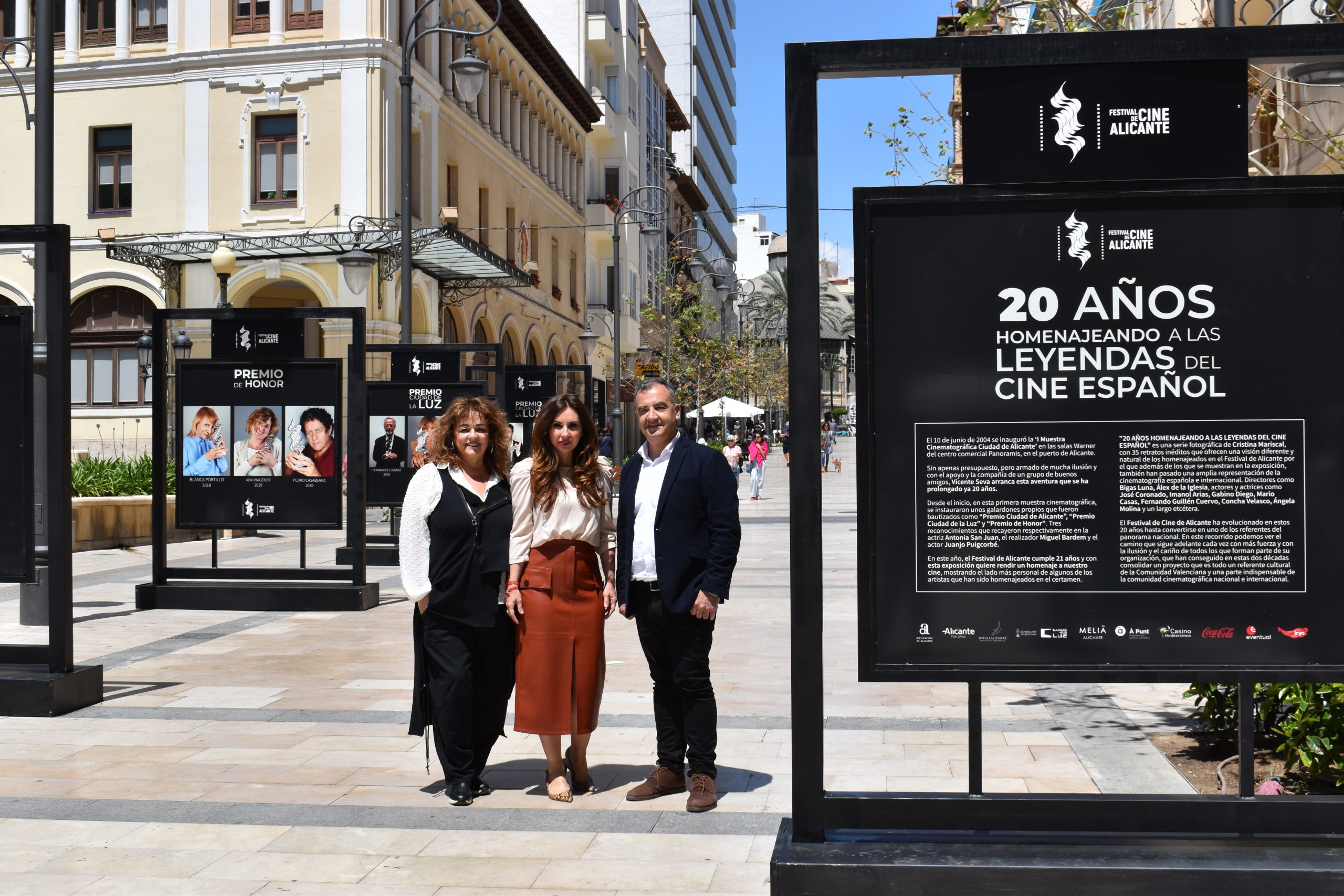 La avenida de la Constitución de Alicante acoge desde este martes la exposición “20 años homenajeando a las leyendas del cine español” organizada por el Festival Internacional de Cine de Alicante que han inaugurado la concejala de Turismo, Ana Poquet y el director del festival, Vicente Seva. Esta muestra fotográfica homenajea a quienes han sido premiados por este certamen a lo largo de su trayectoria. Poquet ha animado a «alicantinos y visitantes a darse un paseo tranquilo por la avenida de la Constitución para poder disfrutar de la exposición del Festival de Cine de Alicante«. La edil ha señalado que «con esta iniciativa el festival se acerca aún más a la ciudad y la hace partícipe» y se une además a «la muestra que acaba de inaugurar en la estación de Adif que da la bienvenida a los visitantes«.