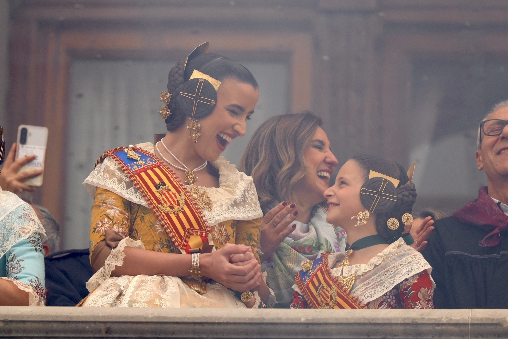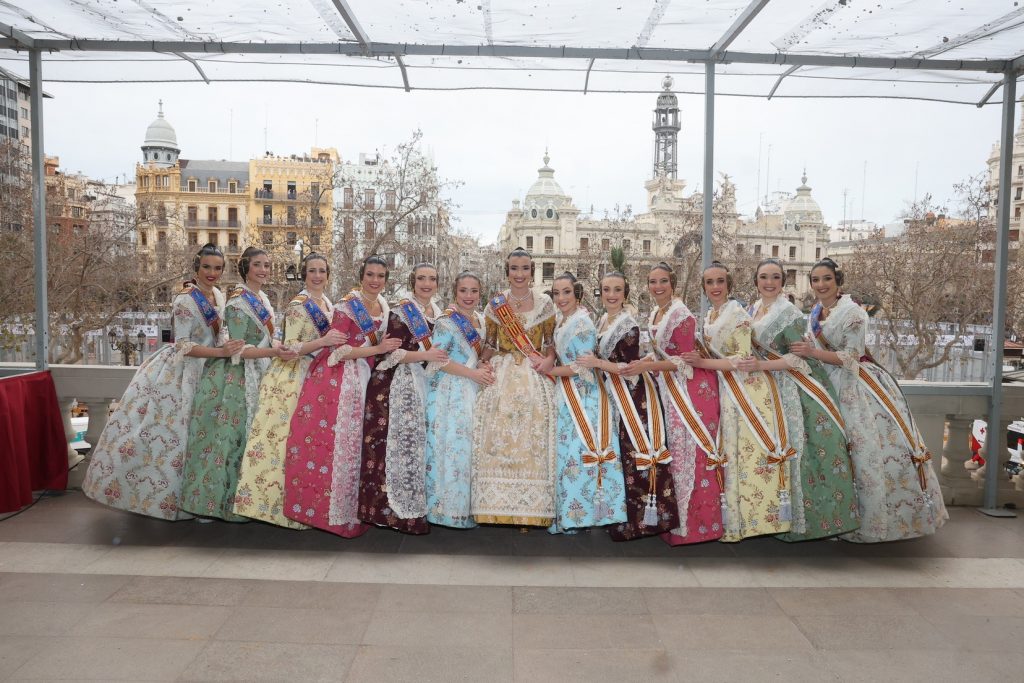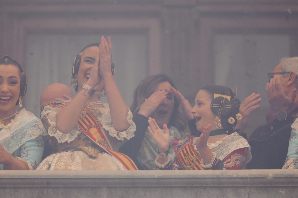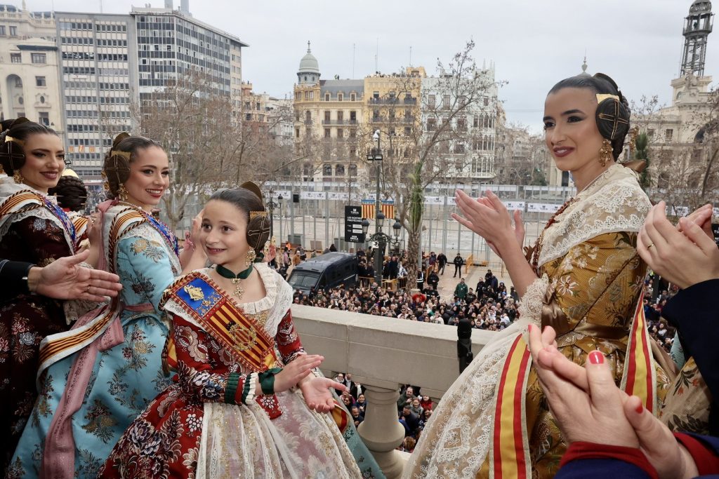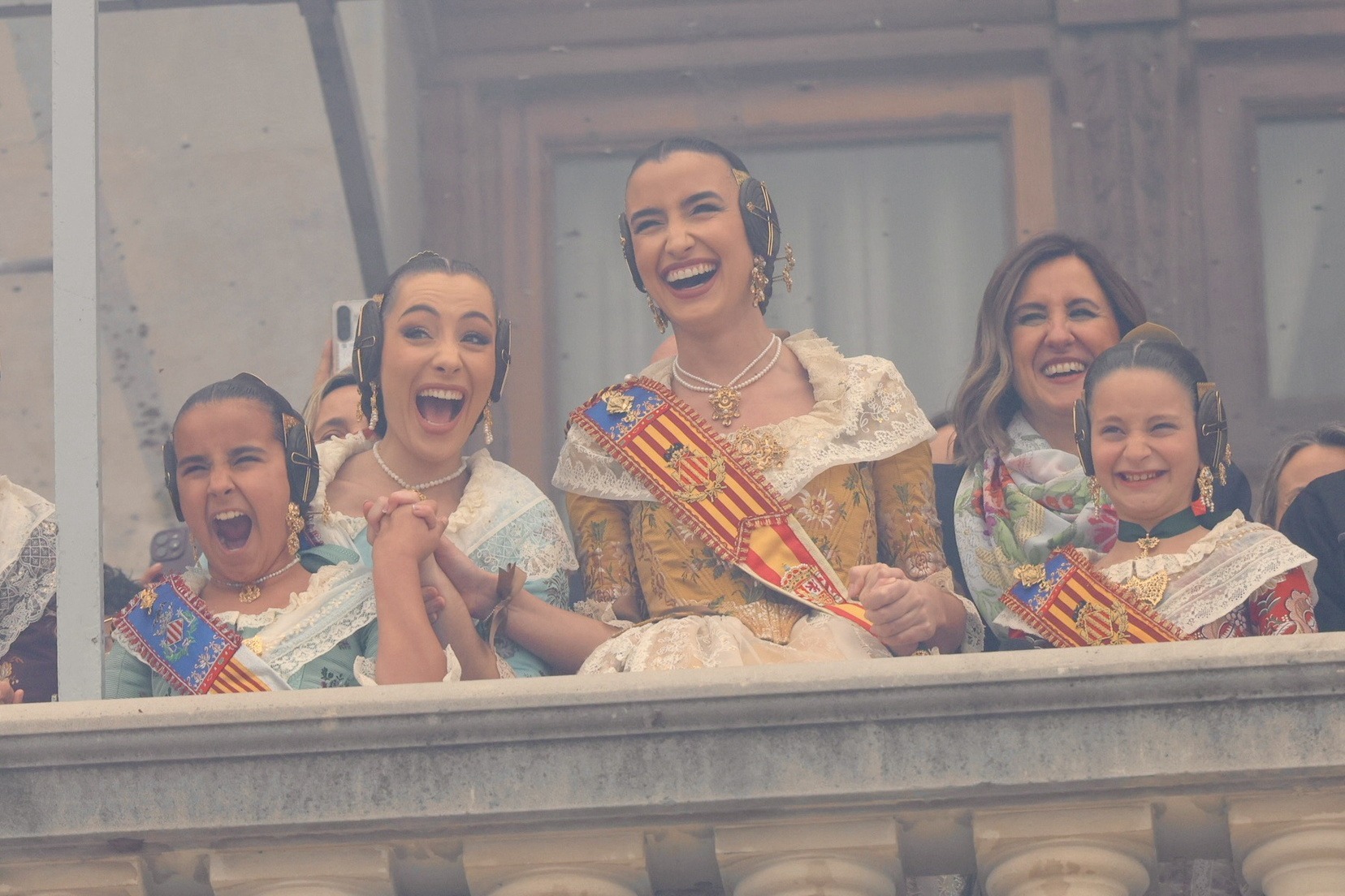 En el Balcón del Ayuntamiento, las Falleras Mayores de Valencia, Carmen Prades y Marta Mercader, han sido testigos de esta segunda mascletà de marzo, acompañadas por sus Cortes de Honor y de la alcaldesa de nuestra ciudad, María José Catalá, y Santiago Ballester, concejal de Fallas y presidente de Junta Central Fallera.