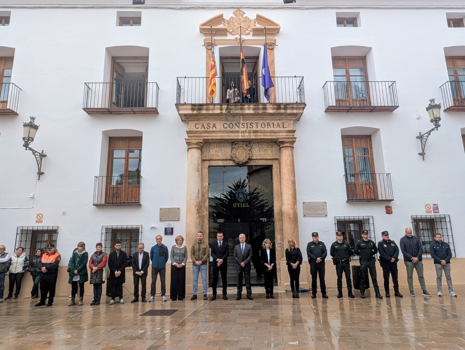 El acto, celebrado en la Plaza del Ayuntamiento de Utiel con las banderas a media asta y crespón negro, ha reunido a numerosos vecinos que han querido mostrar sus condolencias por las 6 personas fallecidas en Utiel y como acompañamiento a todas las personas que están sufriendo las consecuencias de la DANA.