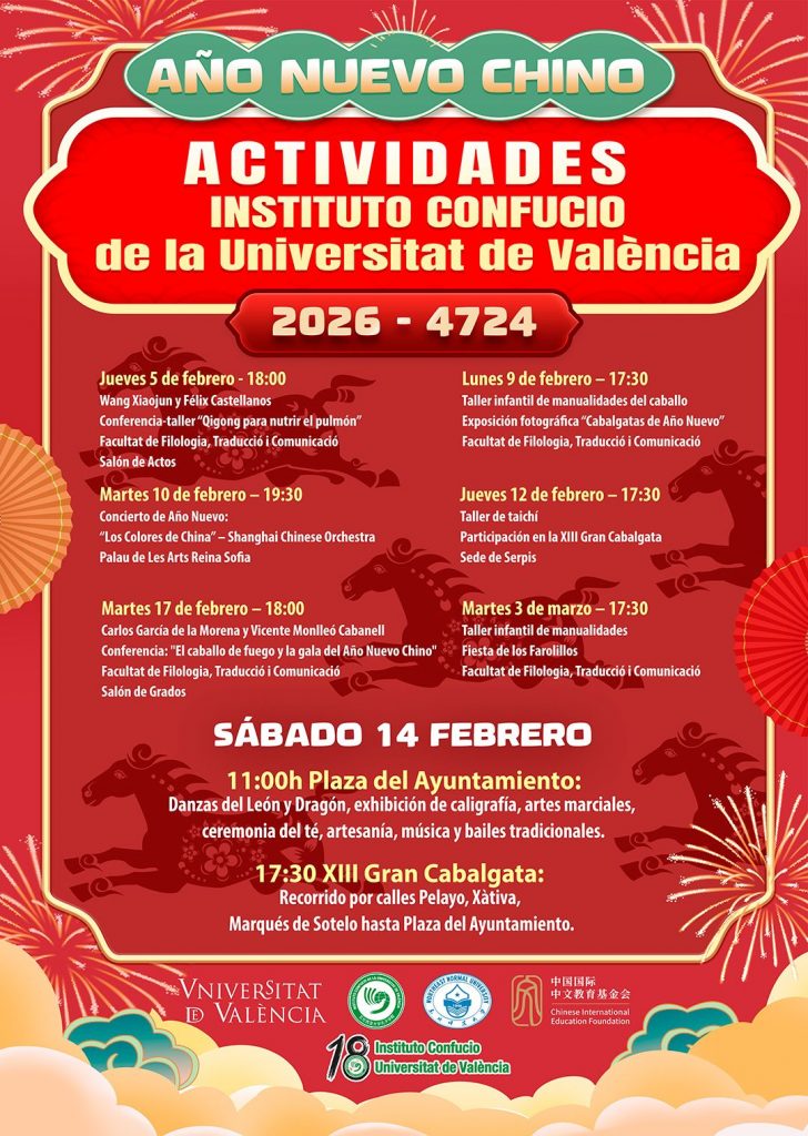 11h Feria cultural – Plaza del Ayuntamiento. La plaza se convierte en un escenario vivo con las carpas culturales de acceso libre del Instituto Confucio. Disfruta de exhibiciones de artes marciales, danza del León y del Dragón, exhibiciones de caligrafía, la ceremonia del té, artesanía, música y bailes tradicionales durante toda la jornada.