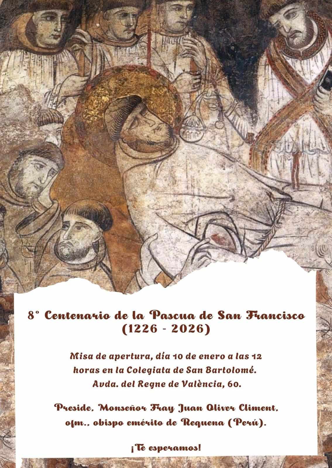 En el año 2026 se conmemora el VIII Centenario de la muerte de San Francisco de Asís, santo italiano fundador de la Orden Franciscana en el siglo XIII, cuya espiritualidad y apostolado sigue vigente y muy presente en la diócesis de Valencia, donde numerosas parroquias y localidades lo tienen como patrón o titular.