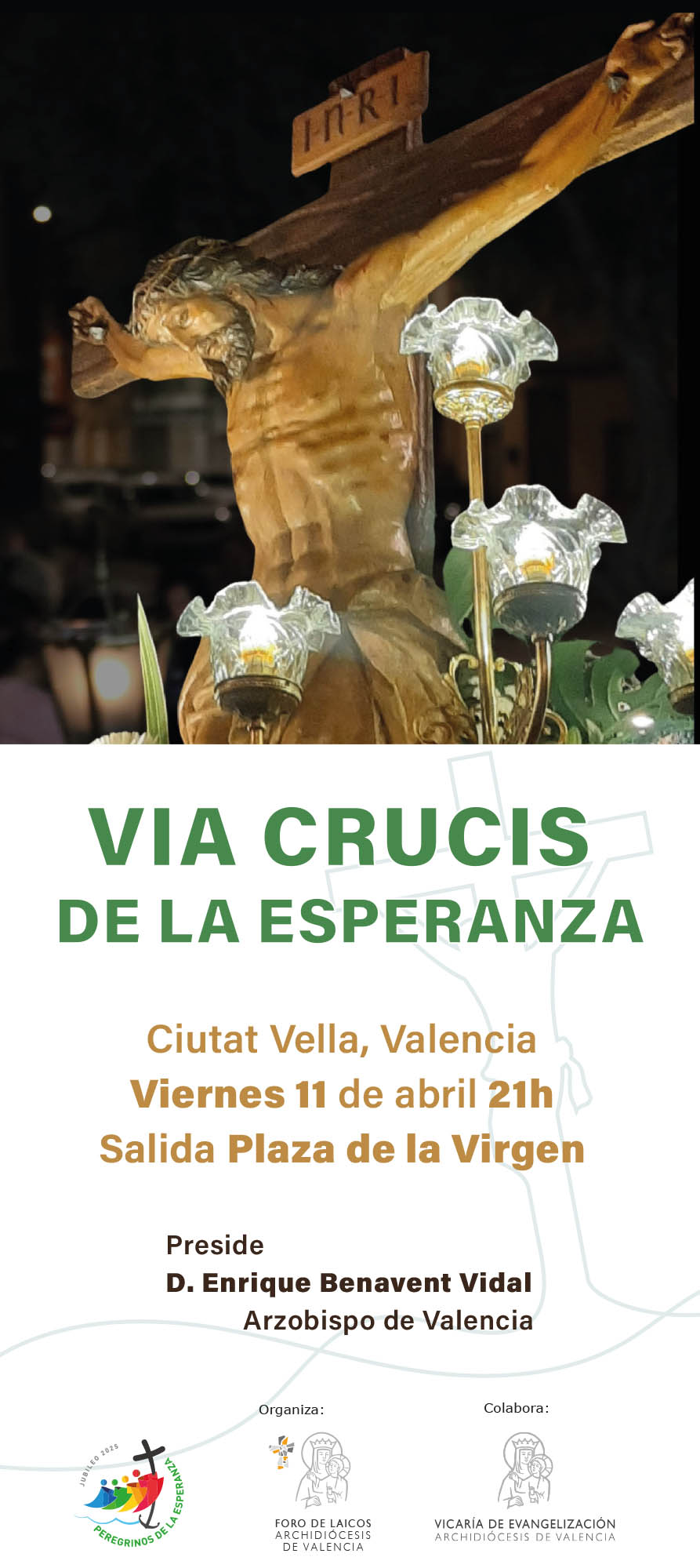 El Arzobispo de Valencia, mons. Enrique Benavent, presidirá este viernes el solemne Vía Crucis diocesano que recorrerá las calles del centro histórico de Valencia, en el distrito de Ciutat Vella, organizado por el Foro de Laicos junto a la Vicaría de Evangelización.
