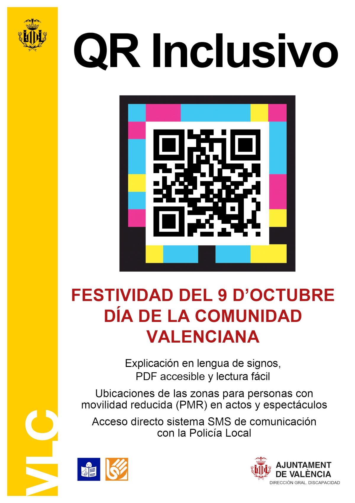 La Dirección General de Discapacidad del Ayuntamiento ha difundido un QR inclusivo para que las personas con discapacidad que escaneen este código con un dispositivo móvil puedan acceder a toda la información relacionada con la celebración del 9 d’Octubre, con contenidos adaptados y en formatos accesibles.