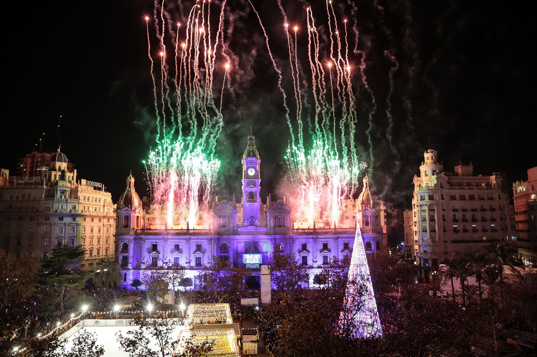 El Ayuntamiento de València ha preparado para despedir 2024 y recibir el nuevo año el lanzamiento simultáneo de cuatro castillos artificiales a lo largo del viejo cauce del río y desde la plaza de L’Ajuntament. El cuádruple disparo, que iluminará el cielo de la ciudad con 20 tonalidades cromáticas diferentes, correrá a cargo de Pirotecnia Vulcano, tal como sucedió en la Nochevieja pasada. Los cuatro castillos artificiales se dispararán desde el edificio consistorial y desde tres puntos del Jardín del Turia situados a la altura de las Torres de Serranos, la Alameda y la rosaleda de la Ciutat de les Arts.