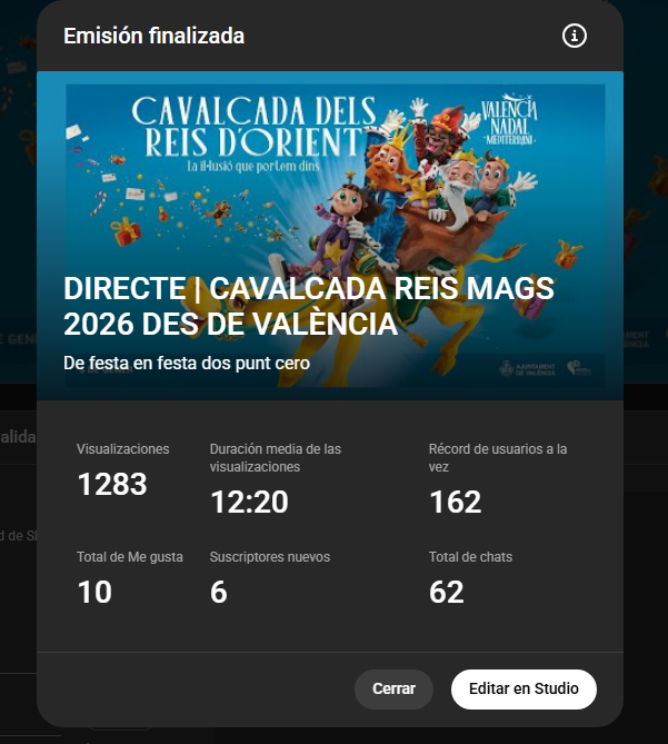 Hasta el momento de realizar este post (21:15h) el video tiene 1283 visualizaciones. Un total de 10 me gusta y 6 nuevos suscriptores. Muchas gracias y feliz Noche de Reyes.