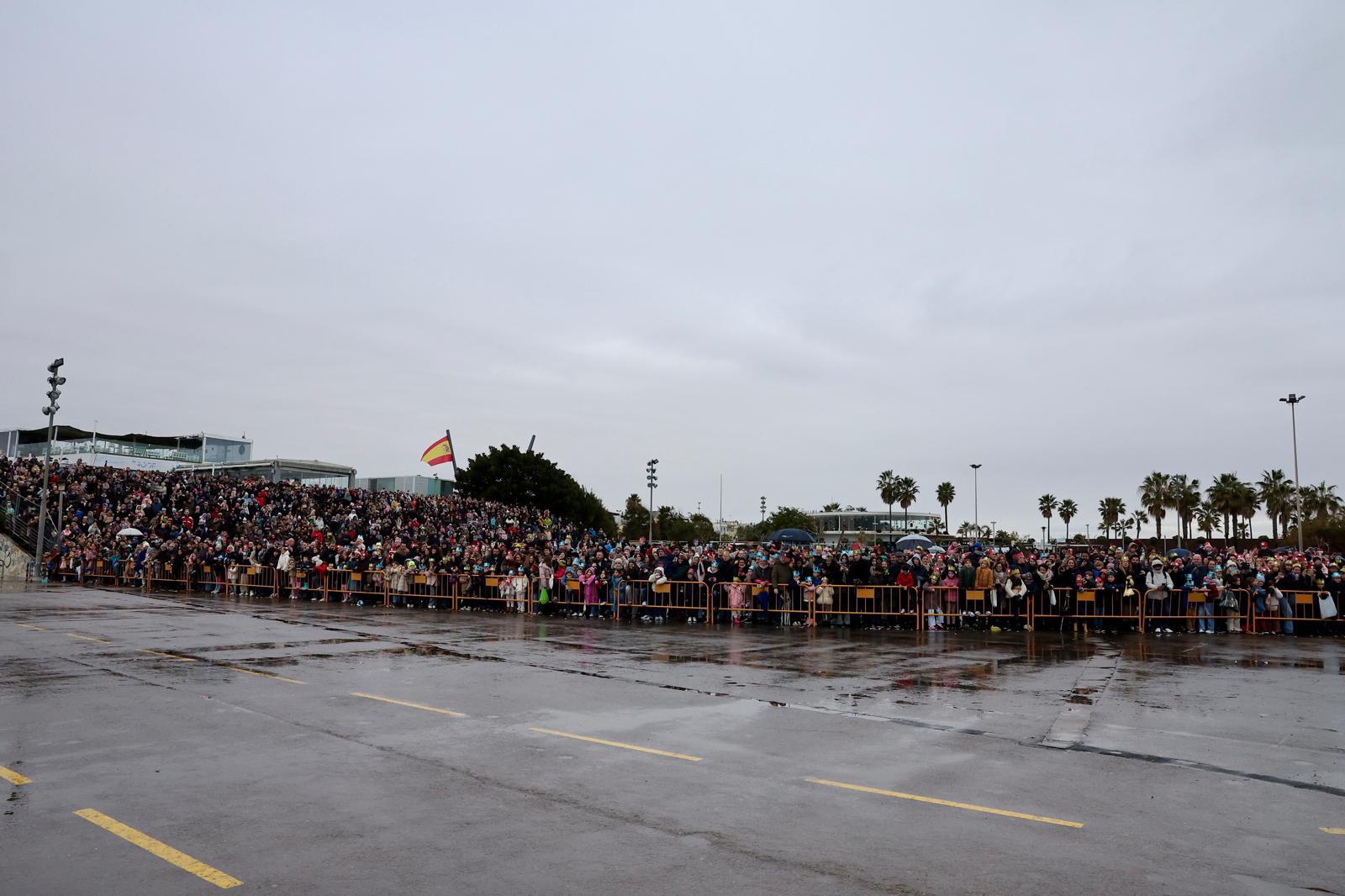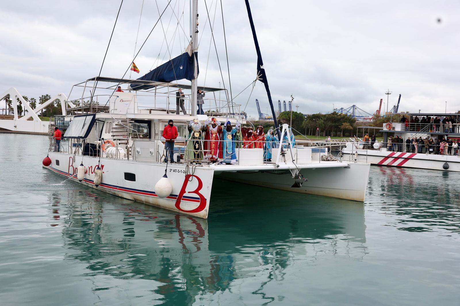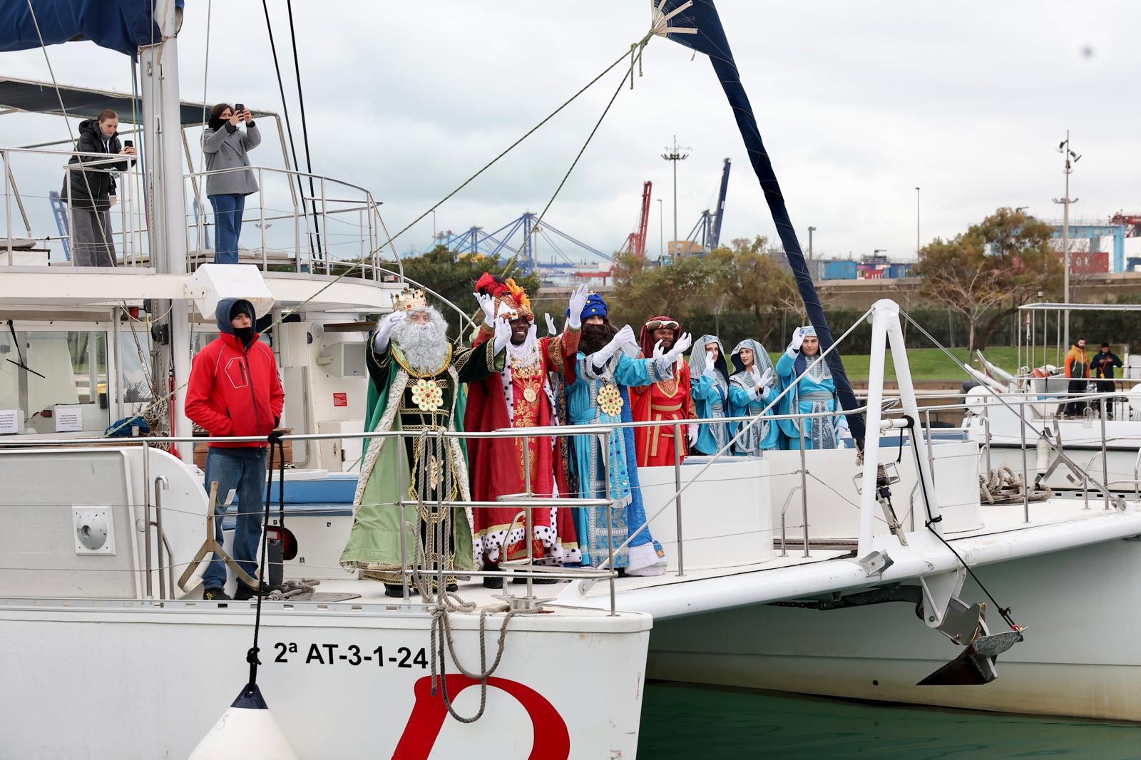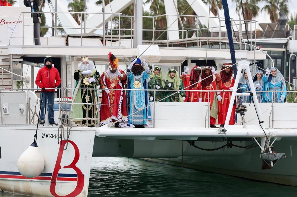 Melchor, Gaspar y Baltasar, han llegado como es habitual, por el mar, a bordo de un catamarán desde que han saludado a una marea de niños muy abrigados. Al llegar a la Marina Norte, sus Majestades de Oriente se han dirigido por primera vez en este nuevo punto, la plaza de la Sal.