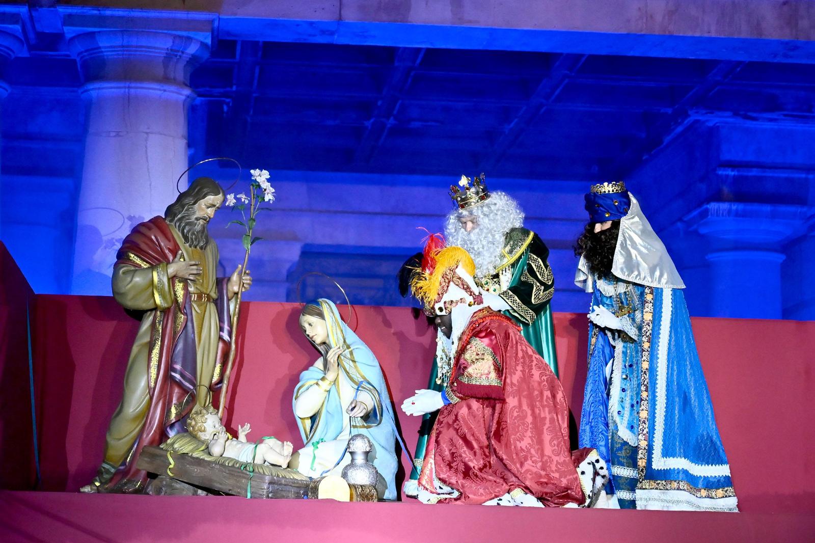 Al final el recorrido, Sus Majestades, han celebrado la adoración de los Reyes Magos al niño Jesús, con ambientación musical coordinada con un espectáculo pirotécnico desde la azotea del edificio consistorial. Todo seguido sus Majestades han subido al balcón del Ayuntamiento desde un camión de bomberos para lanzar un mensaje a los niños, antes de recibirlos en el Salón de Cristal.