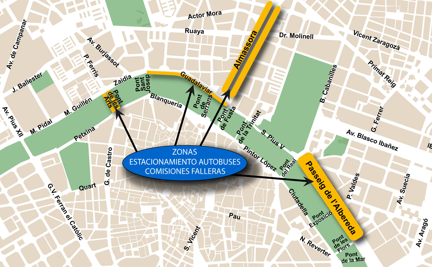 Los días de la Ofrenda, los autobuses de las comisiones estacionarán en el paseo de la Alameda (entre el puente del Real y el de las Flores), ambos sentidos de la calle Almassora y del puente de las Artes, y en un carril de la marginal izquierda desde el puente de San José hasta el de madera.