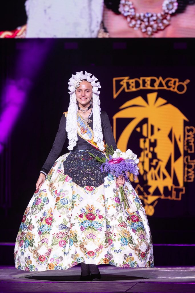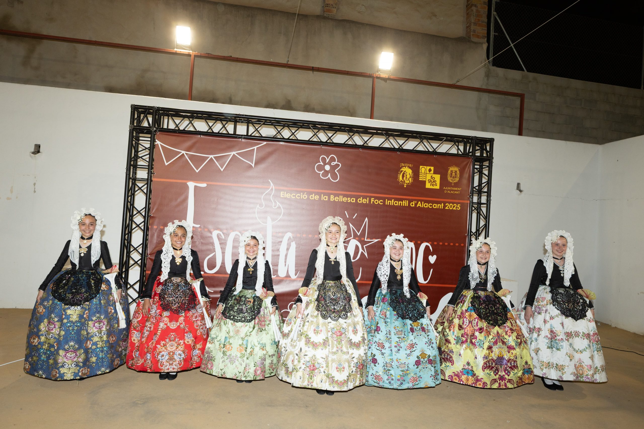 El espectáculo ha empezado a las 2100 horas de la noche con el título de «Escola de Foc«, en el cual las candidatas infantiles han desfilado en traje de gala y de novia alicantina ante más de 6.000 espectadores que han llenado el coso alicantino. El acto ha sido presentado por Hugo Olivares, de Foguerer-Carolinas, Manuela Moya (Florida-Portazgo), y Candela Mas (Princesa Mercedes). Casi 200 bailarines de las distintas comisiones han conformado el cuerpo de baile en las diferentes escenas.