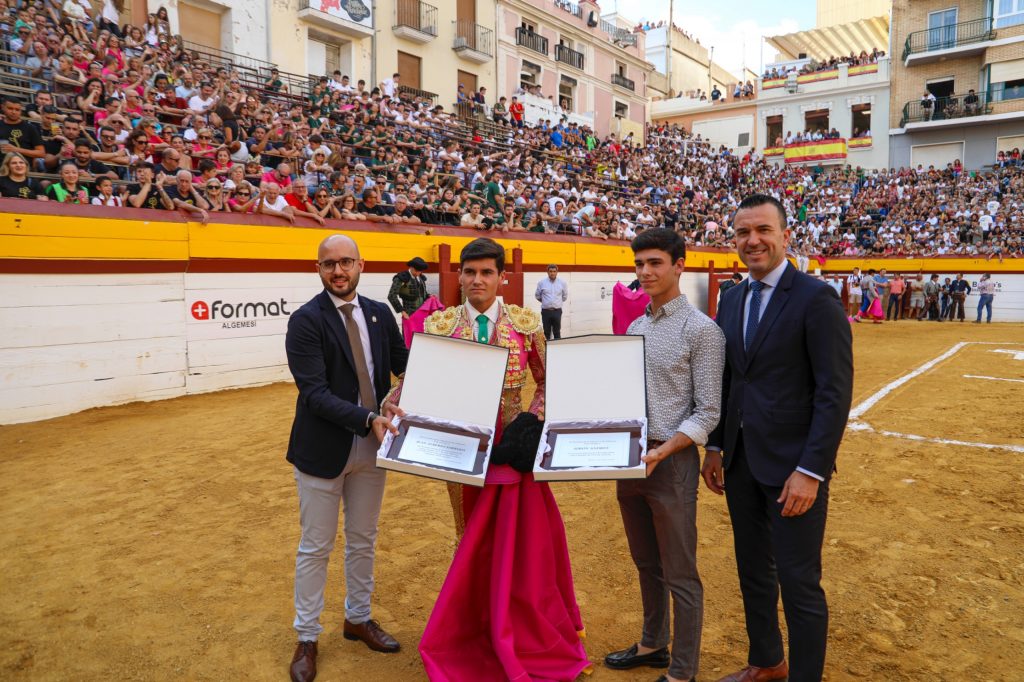 La jornada taurina de Vicent Mompó se completó con su presencia en la novillada de la Feria de Algemesí en la que torearon tres novilleros valencianos, como son Nek Romero, Juan Alberto Torrijos y Simón Andreu. Al finalizar el paseíllo, el presidente de la Diputación, acompañado por el alcalde de Algemesí, José Javier Sanchis, y por el director de la Escuela Taurina, Toni Gázquez, bajó al centro del ruedo para entregar la placa de la escuela a Juan Alberto Torrijos, alumno de la escuela taurina que debutó con caballos, y a Simón Andreu, también alumno de la escuela que debutó con caballos en Málaga.