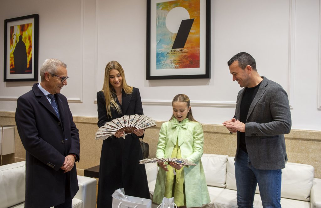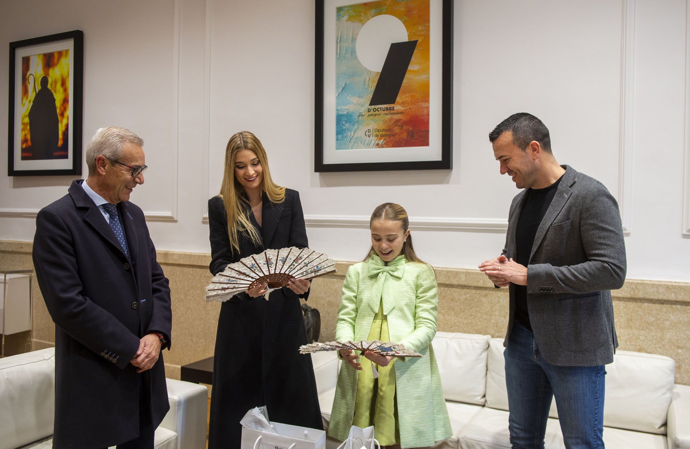 Al finalizar la visita, el presidente ha entregado a las Falleras Mayores sendos abanicos personalizados elaborados artesanalmente por Di Abani. Asimismo, Berta Peiró y Lucía García han obsequiado a Mompó con una pieza de edición limitada y numerada realizada por el artista Sergio Amar.