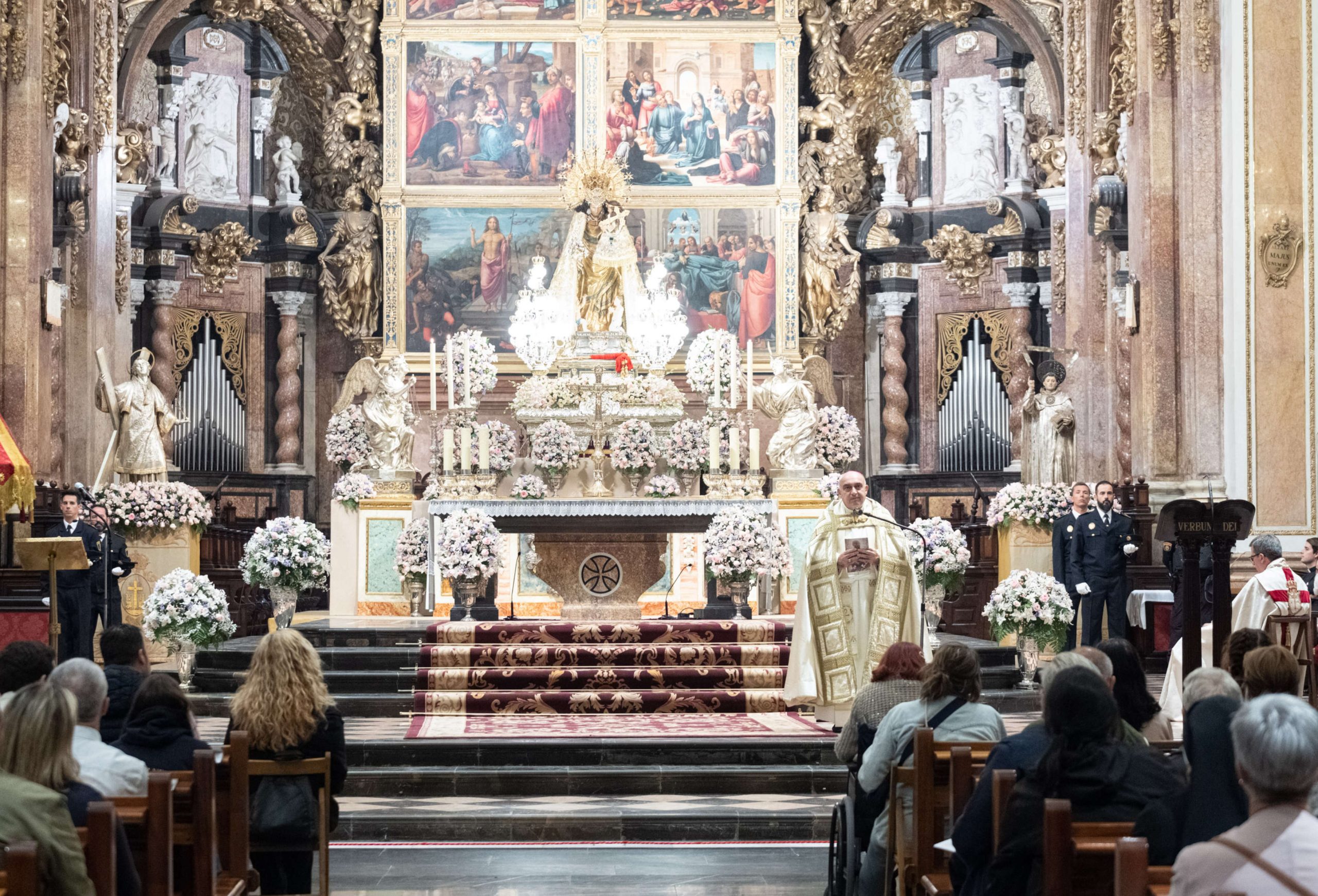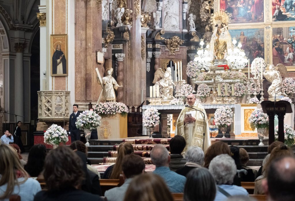 El arzobispo de Valencia, monseñor Enrique Benavent, comenzó su homilía destacando la sensación de pequeñez que experimentamos ante el misterio de la Virgen madre estos días cuando nos colocamos ante la imagen de la Virgen de los Desamparados.