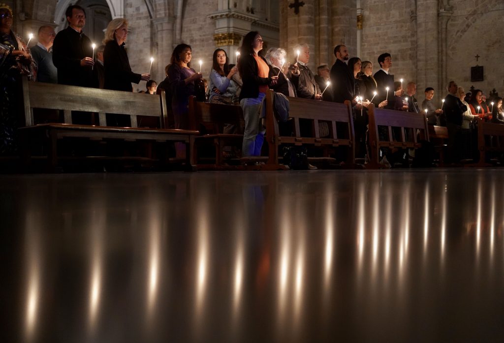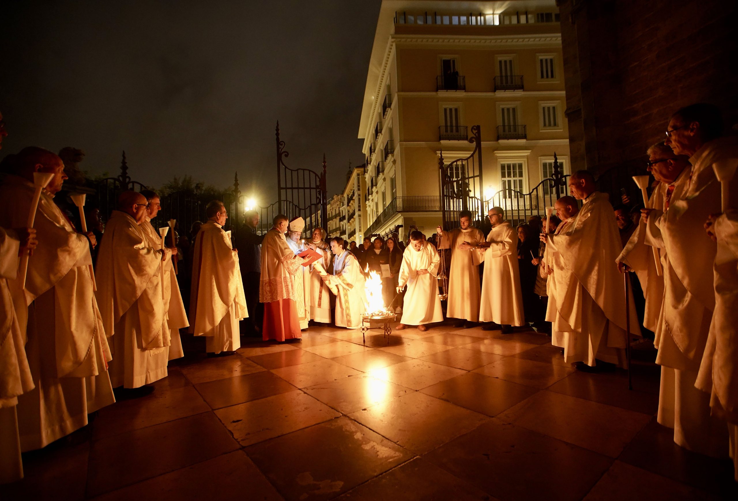 Ayer Sábado Santo, 8 de abril, se celebró en la Catedral el Oficio de Lecturas y Laudes y por la noche, el Arzobispo presidió la solemne Vigilia Pascual, que se inició con la bendición del “nuevo fuego” en la Puerta de los Hierros y el posterior lucernario en el interior de la Seo.