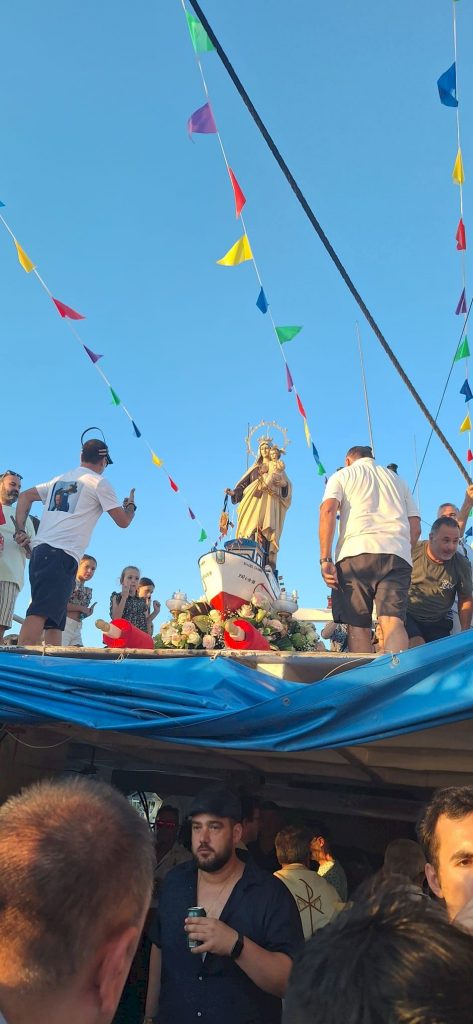 Al llegar al puerto, las embarcaciones esperaban a la Virgen del Carmen, cuya imagen también subió a bordo de una de ellas. Empezaba la procesión marinera por la bahía de Villajoyosa en una travesía a la que se unieron barcas de pesca así como embarcaciones de recreo engalanadas con banderitas de papel.