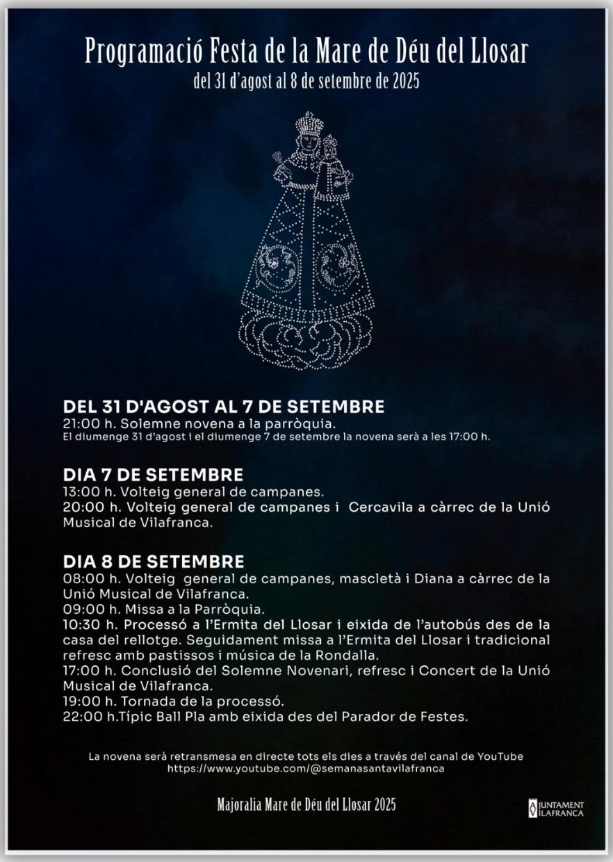 El dilluns dia 8 de setembre, religió i germanor s’uniran perquè vilafranquins, vilafranquines i visitants puguen gaudir al màxim del Dia de la Mare de Déu del Llosar. Les majoralesses d’aquest any han presentat tot un programa on la tradició és la principal protagonista.