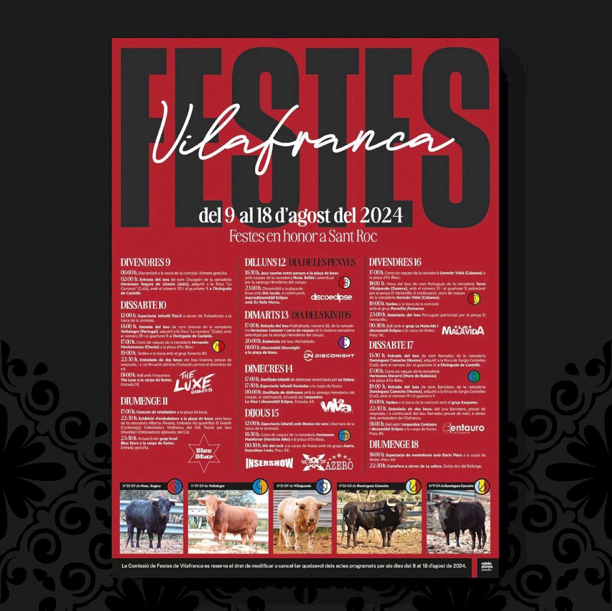 Vilafranca honrarà a Sant Roc durant les festes patronals organitzades per la comissió de festes del 9 al 18 d’agost. La col·laboració de veïns i entitats del poble i el suport de l’Ajuntament trauran endavant unes celebracions que arrancaran amb el muntatge de cadafals a primera hora del divendres per a donar pas al volteig de campanes i les competicions esportives de vesprada. Eixa nit serà la presentació de representats i inauguració de les festes, que s’allargarà de matinada, quan està prevista la primera exhibició taurina.