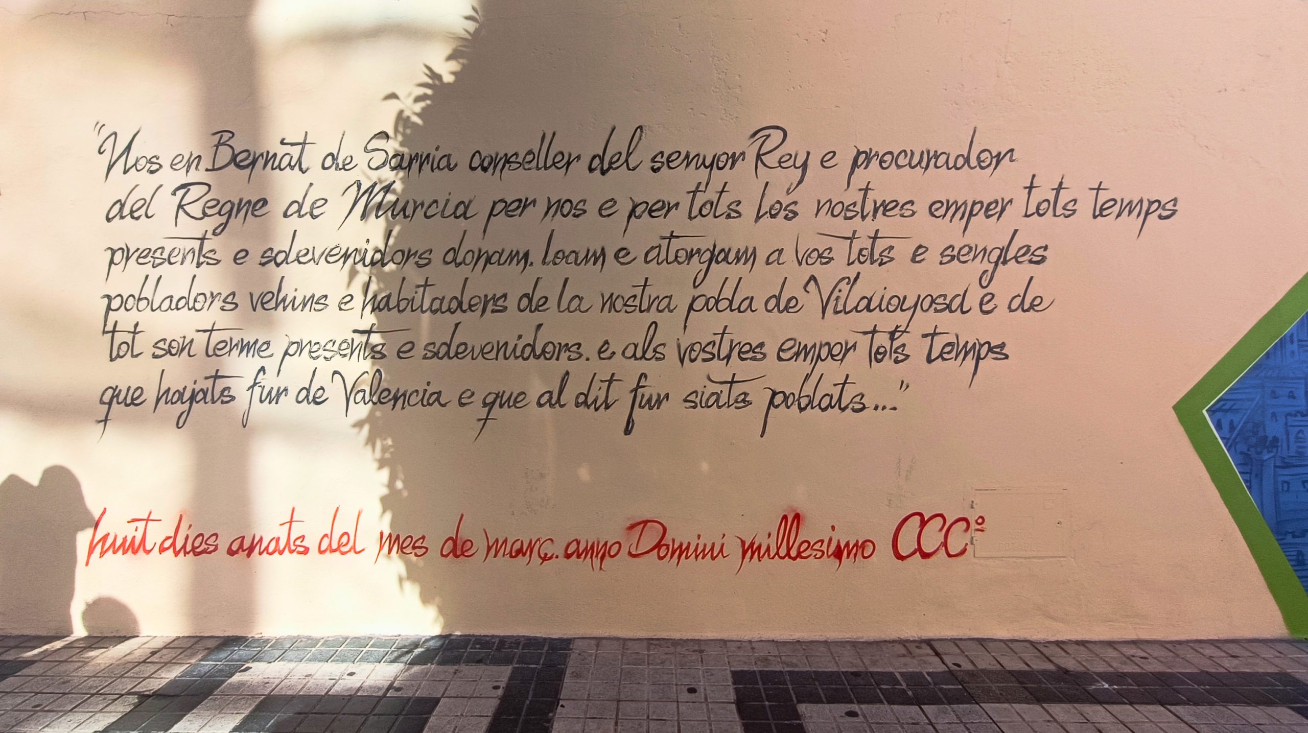 Villajoyosa rinde homenaje al 725 aniversario de su fundación como ciudad con un mural conmemorativo que recoge el logo de esta efeméride, así como un fragmento de la Carta Pobla del almirante Bernat de Sarrià.