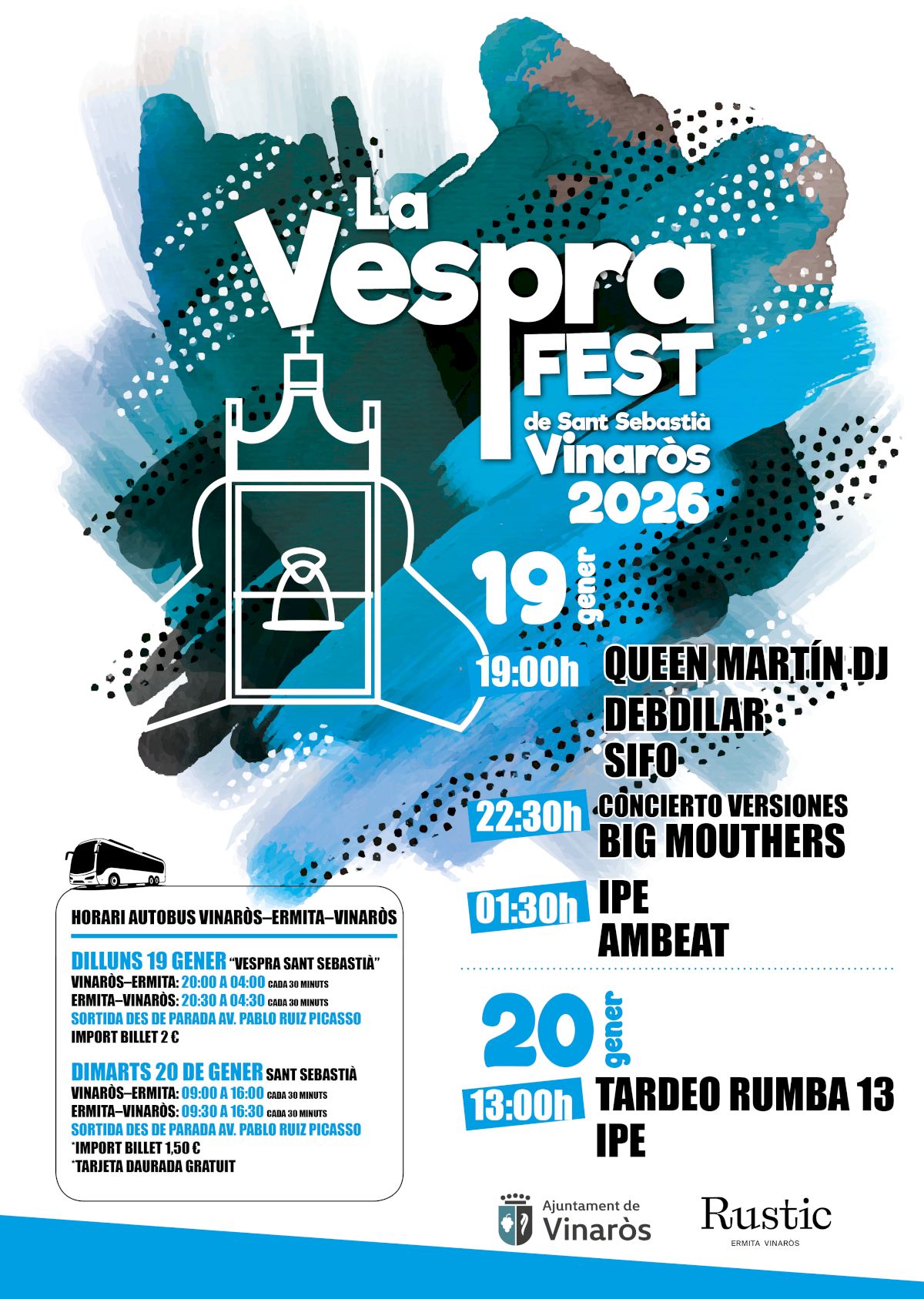 Lunes se celebrará la Víspera de San Sebastián con una jornada cargada de música en directo y actuaciones de disc-jockeys. A las 19:00h empezará la programación con Queen Martín DJ, Debdilar y Sifo, a las 22:30h será el turno del grupo Big Mouthers con concierto de versiones, mientras que Ipe Ambeat será el encargado de cerrar la noche con la actuación que ofrecerá a partir de la 1:30h.