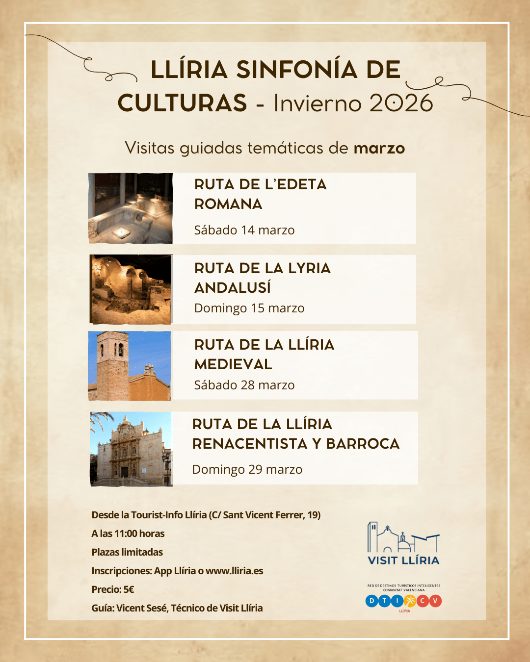 Así, la localidad edetana continúa con su promoción turística ofreciendo una nueva tanda de rutas guiadas tematizadas. El área de Turismo ha preparado los itinerarios turístico-culturales de la Edeta Romana y de la Lyria Andalusina para el fin de semana del 14 y 15 de marzo; mientras que se podrá disfrutar de la Llíria Medieval y de la Llíria del Renacimiento y del Barroco los días 28 y 29 de marzo, respectivamente.