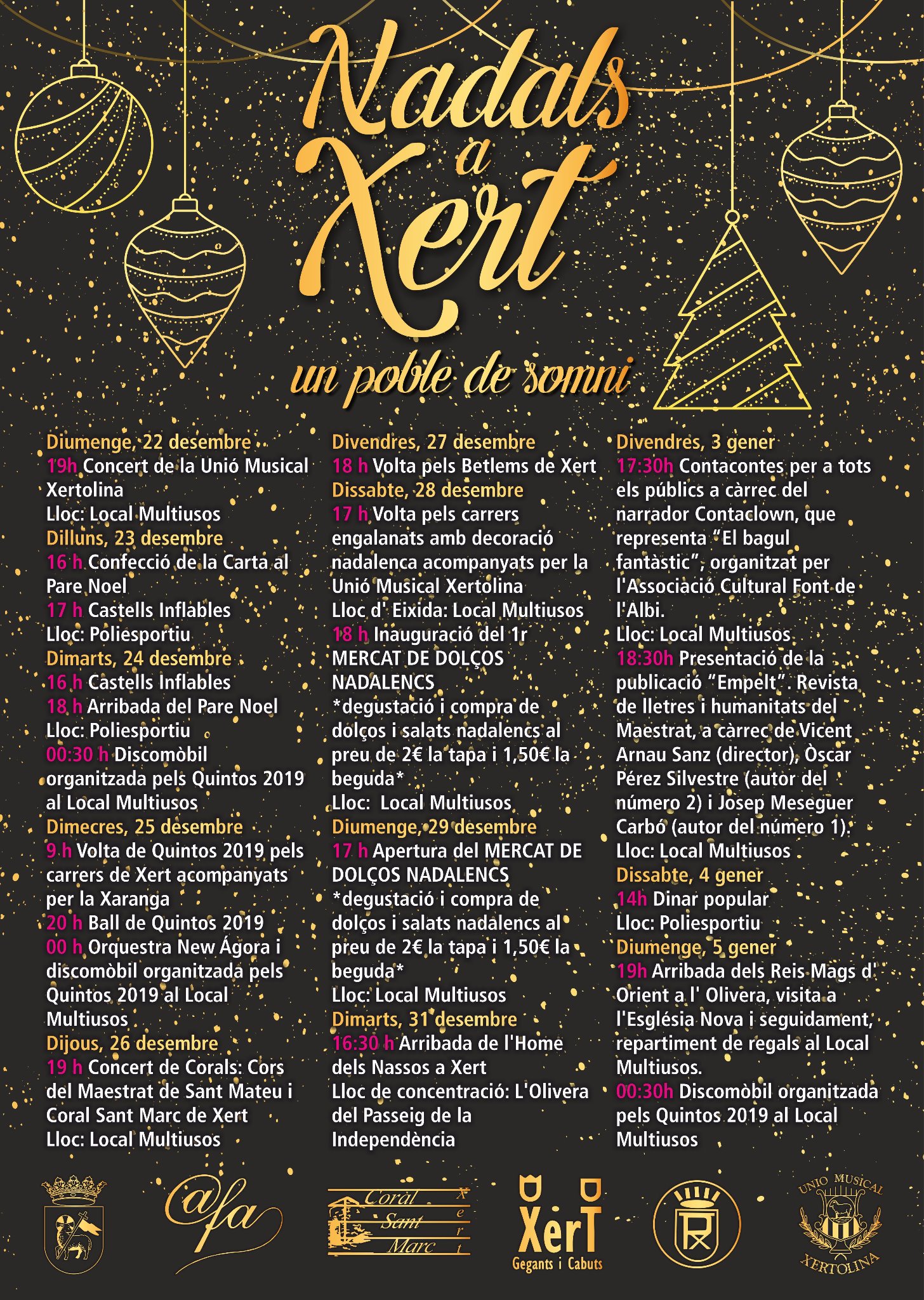 Durant estes festes, Xert es convertirà en un escenari nadalenc en el qual no faltaran esdeveniments culturals, activitats tradicionals, música i propostes per a tots els públics. Concerts, visites guiades, misses i activitats per als més joves formen part d’una agenda dissenyada per a ressaltar la bellesa del municipi i el seu atractiu turístic. A més, gràcies a la col·laboració dels veïns, els qui adornen els carrers amb creativitat i il·lusió, Xert es convertirà en un lloc acollidor durant estes dates.