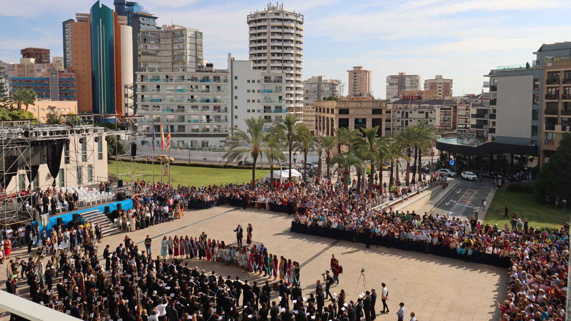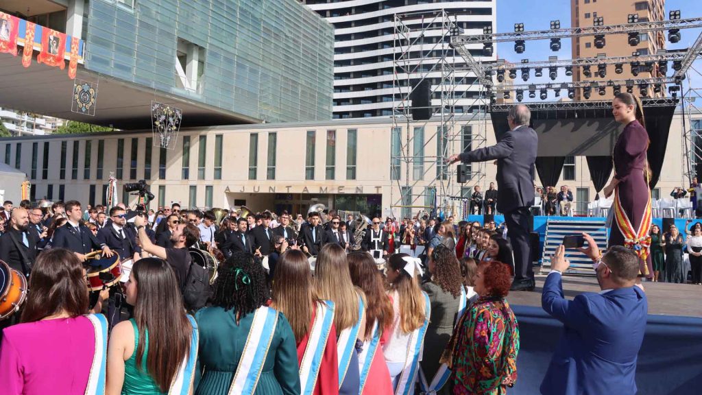 Todas ellas han interpretado distintos pasodobles festeros en su entrada a la plaza y han recibido en sus banderas y estandartes un corbatín de manos de las reinas de este año en conmemoración a su participación en este acto. Poco después ha llegado el esperado momento de todos los congregados: la Interpretación del pasodoble ‘Fiesta en Benidorm’, dirigidos por el compositor de la obra, el maestro Rafael Doménech Pardo, que el público ha acompañado con bailes, palmas y una gran ovación final tras sonar los últimos acordes.