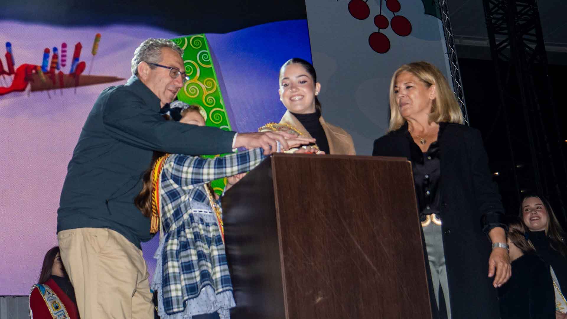 Poco tiempo ha durado la recepción en el Hort de Colón, puesto que reinas y autoridades tenían que presidir la tradicional cuenta atrás que convierte la plaza de SS. MM. los Reyes de España en la Plaza de la Navidad hasta el 7 de enero. Junto al Ayuntamiento, centenares de personas, sobre todo niños, esperaban el momento mágico que ha llegado cuando al alimón el alcalde, la concejal de Fiestas y las reinas, han pulsado el botón de encendido.