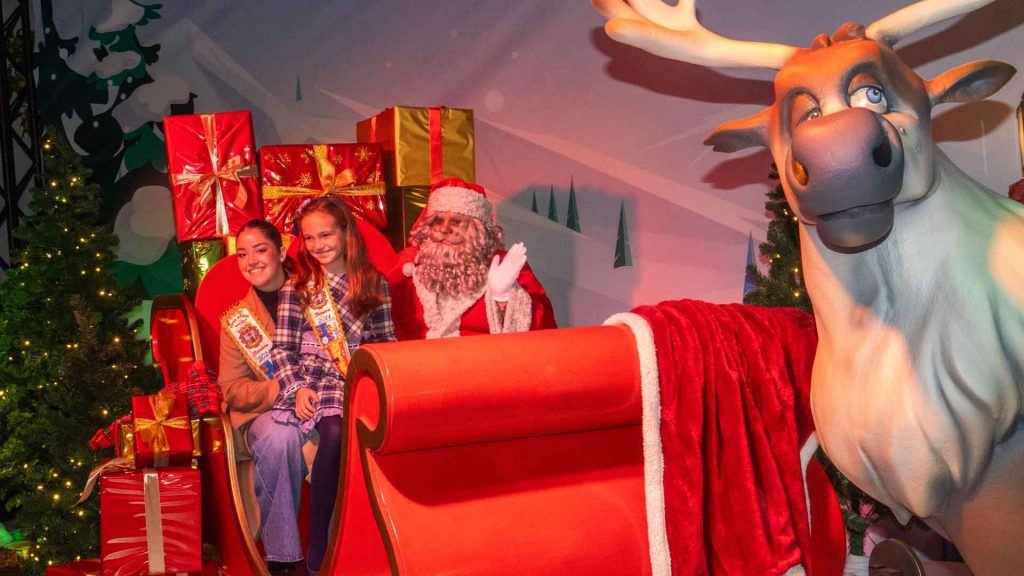 Tras instalarse en el Hort de Colón el mítico personaje que trae regalos a los niños en Nochebuena, junto a uno de sus renos ha recibido, cuando sonaban las 18.00 h, al alcalde, Toni Pérez, y a la concejal de Fiestas, Mariló Cebreros, que han acudido acompañados por las reinas de las Festes Majors Patronals, Valentina Almodóbar y Laia Zamora junto a sus damas y la presidenta de la Comissió, Susana Martínez.
