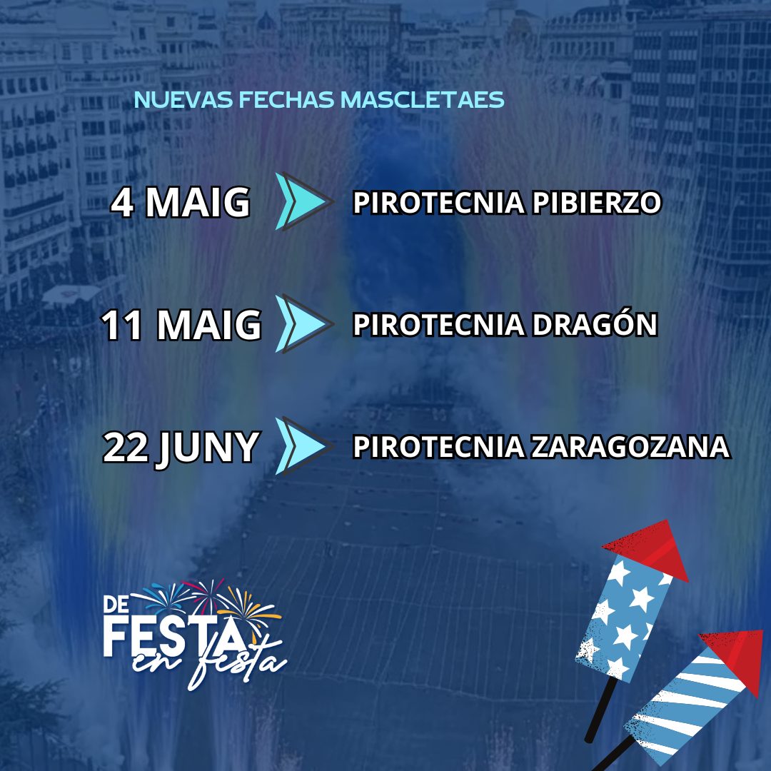 A causa de la lluvia, estos tres espectáculos pirotécnicos no se pudieron disparar en sus fechas oficiales por la lluvia: mascletà del 4 de marzo por la Pirotecnia Dragón; mascletà del 5 de marzo por la Pirotecnia Pibierzo y la mascletà del 6 de marzo por la Pirotecnia Zaragozana.